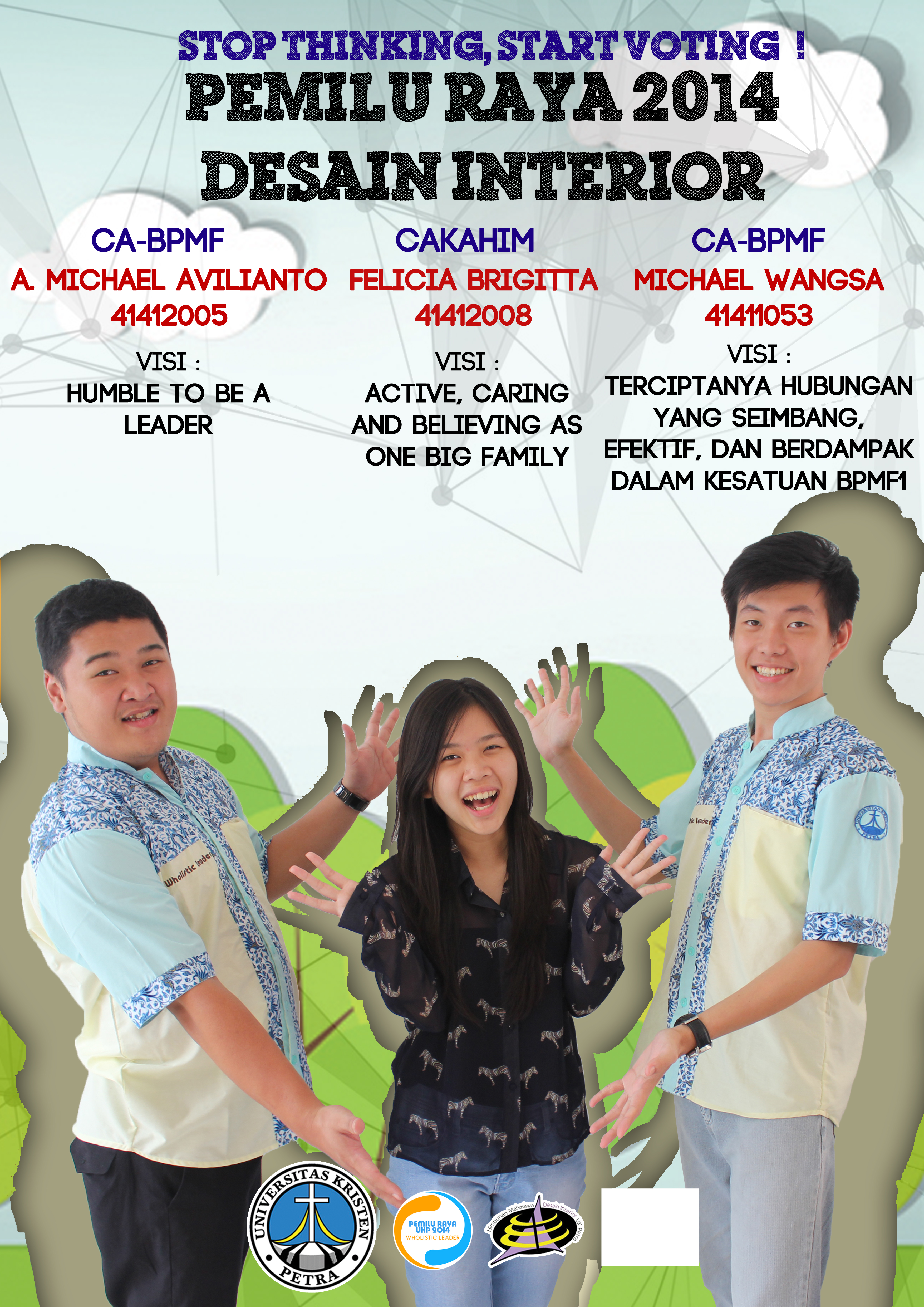 Pemilu Raya Desin Interior 2014, dengan tiga kandidiar sebagai Calon BPMF dan Calon Hima. Tiga kandidiat tersebut adalah Michael Avilianto dan Michael Wangsa sebagai calon BPMF dan Felicia Brigitta sebagai calon Ketua Hima Desain Interior