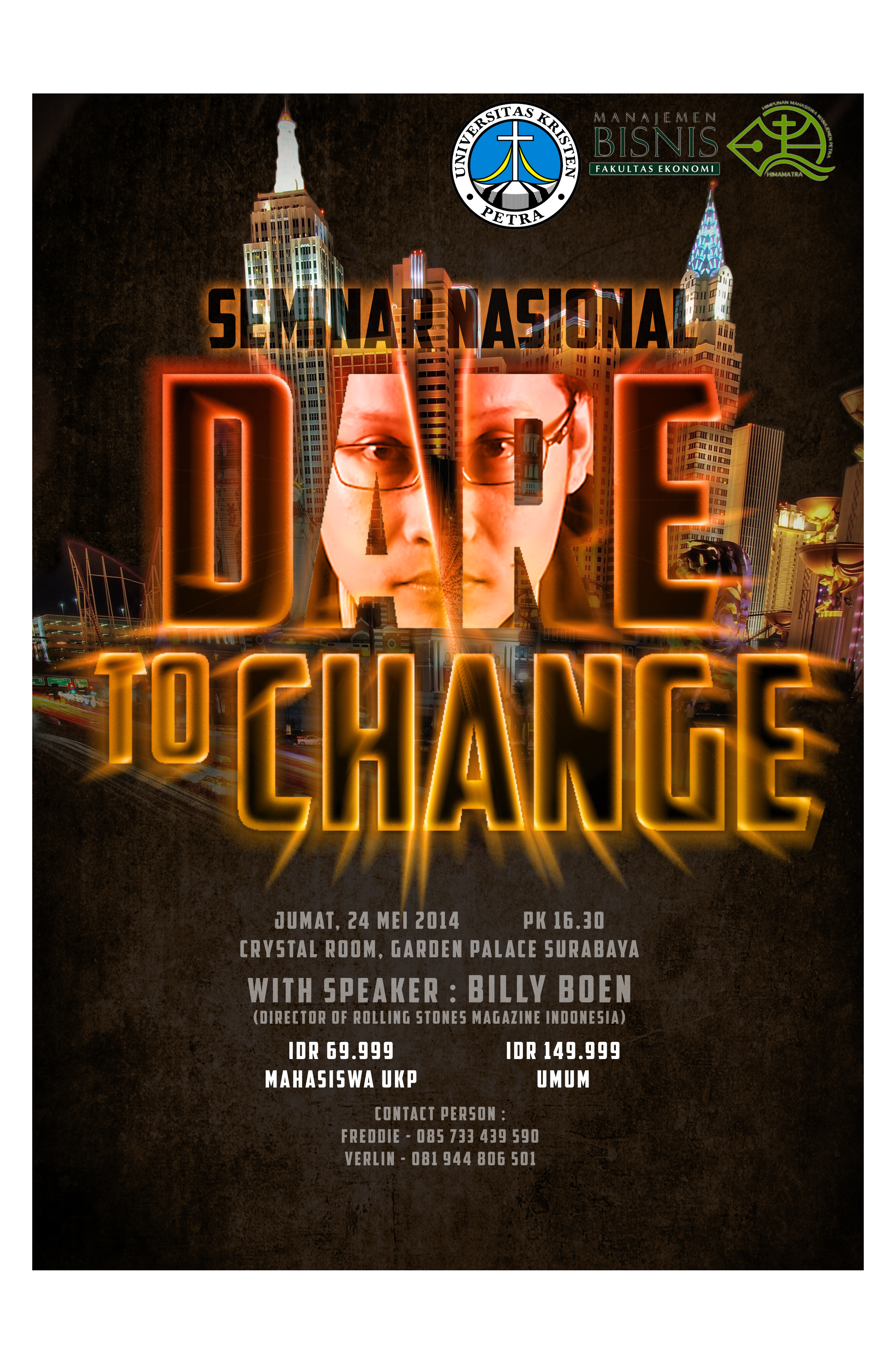 Seminar Nasional yang diadakan oleh Program Studi Manajemen Bisnis ini bertemakan “Dare to Change”, bersama Billy Boen sebagai pembicara. Kegiatan ini dilaaksanakan pada hari Jumat, 24 Mei 2014 pada pukul 16.30 dengan biaya pendaftaran sebesar RP 69.999 untuk mahasiswa UK Petra, dan Rp 149.999 untuk masyarakat umum.