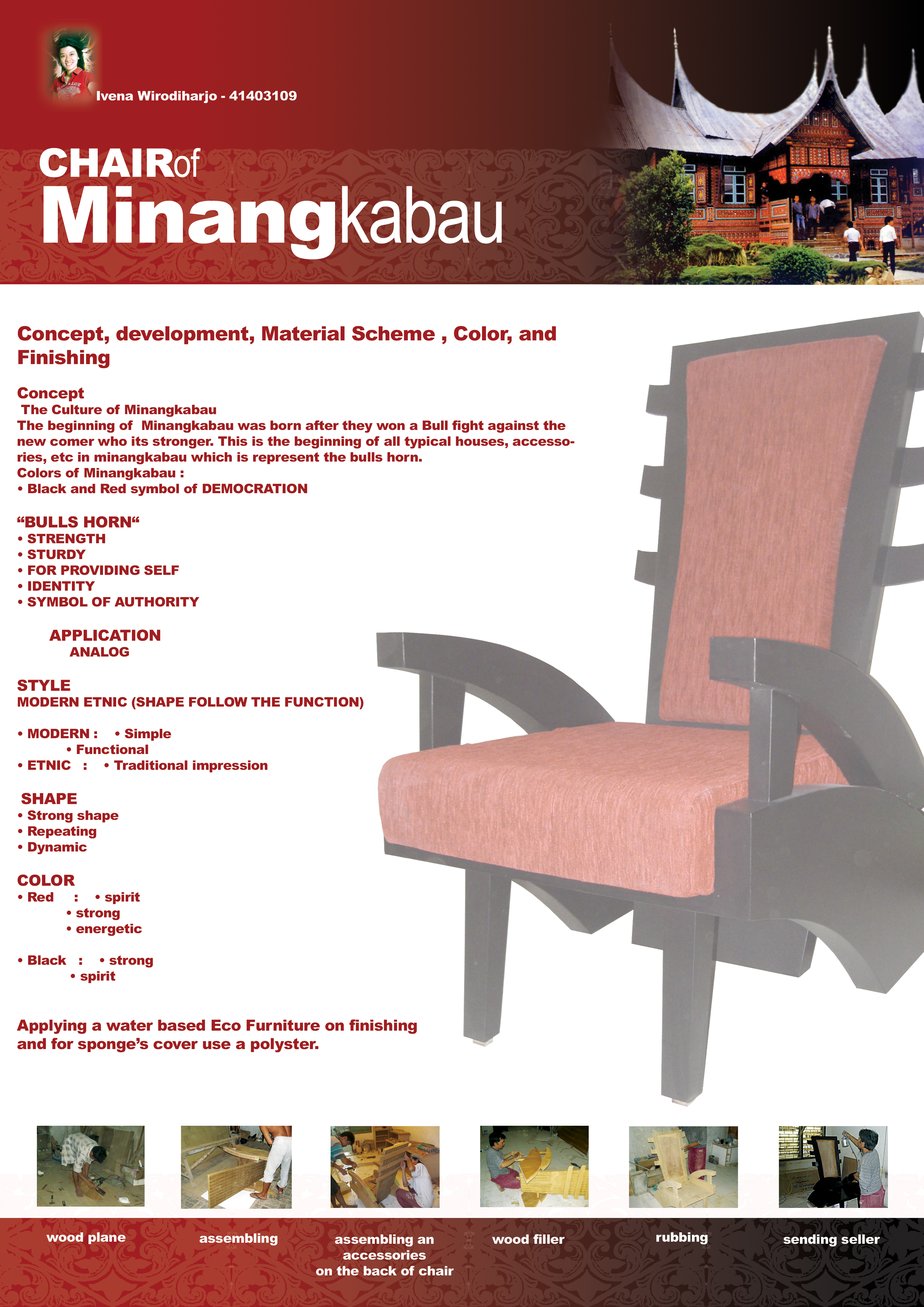 The concept taken from the culture of Minangkabau. The beginning of Minangkabau was born after they won a Bull fight against the new comer who its stronger. This is the beginning of all typical houses, accessories, etc. in minangkabau which is represent the bulls horn. Red color signed of the spirit, strong, and energetic. Black color signed of the spirit and strong.