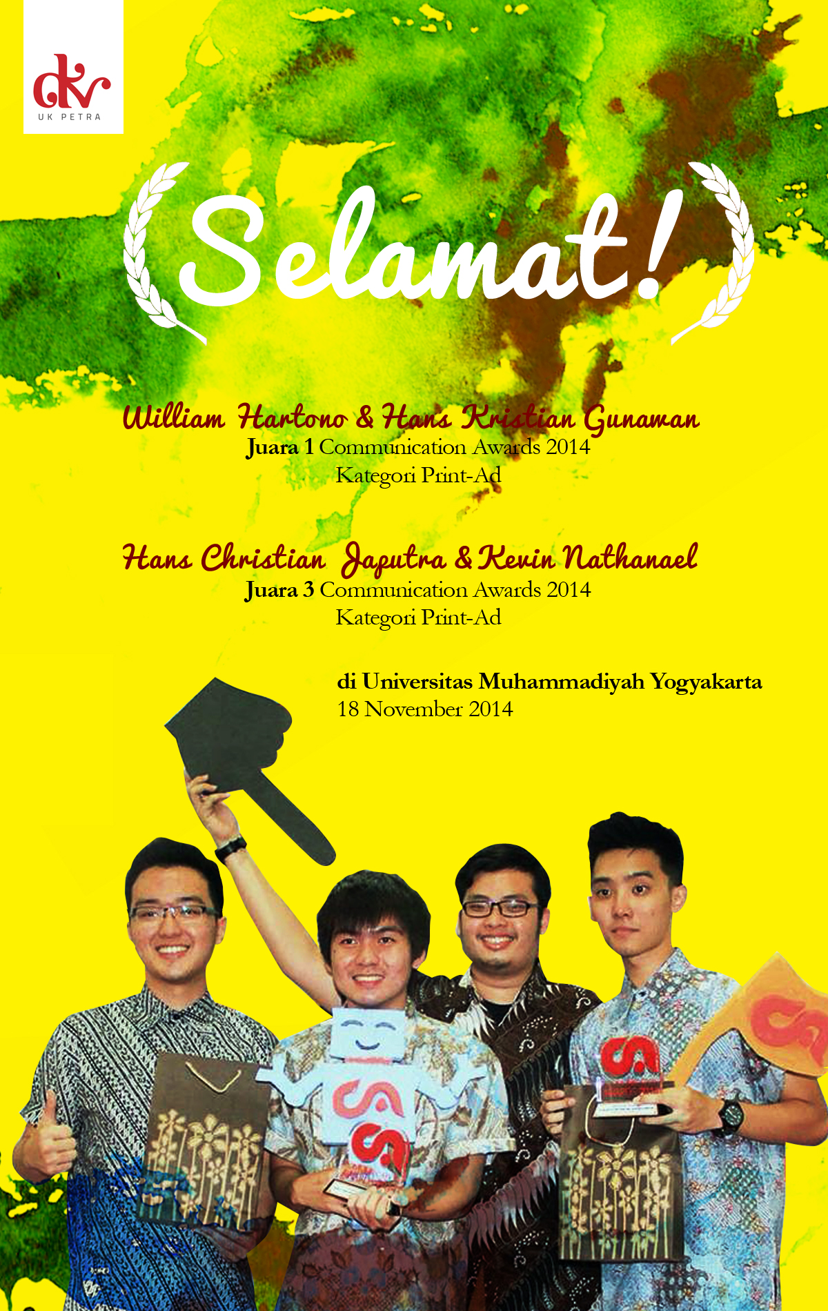 Selamat kepada WIlliam Hartono & Hans Kristian Gunawan sebagai peraih juara 1 Communication Awards 2014 kategori Print-AD, dan kepada Hans Christian Japutra & Kevin Nathanael sebagai peraih juara 3 Communication Awards 2014 kategori Print-AD.
