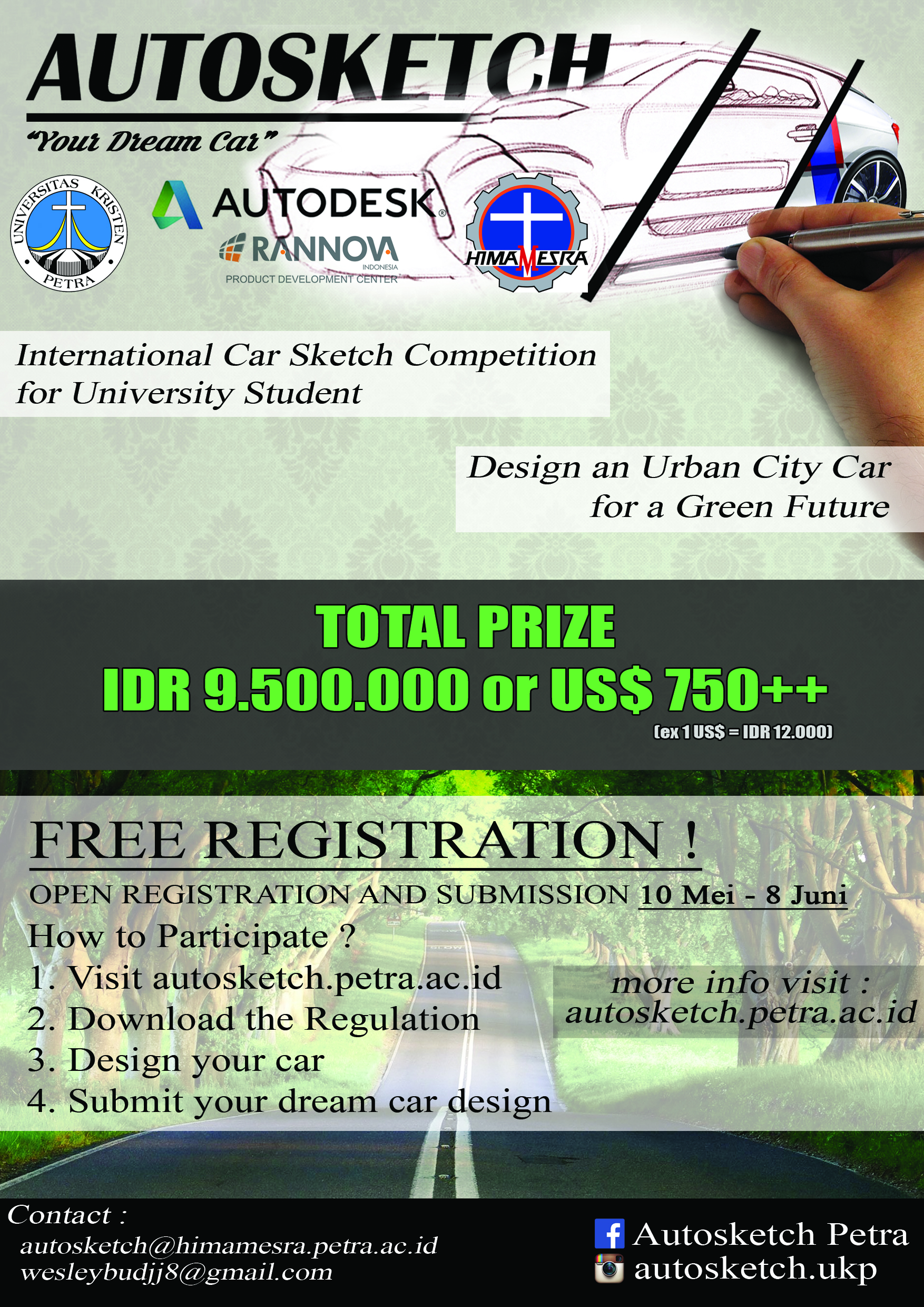 Program Studi Teknik Mesin UK Petra, menyelenggarakan Internasional Car Sketch for University Student. Bagi mahasiswa yang ingin mendaftar dan mengikuti kegiatan tersebut dapat melakukan pendaftaran dengan mengunjungi autosketch.petra.ac.id, mendownload formulir, mendesain mobil, dan menyerahkan desain mobil. Untuk informasi lebih lanjut dapat dilihat di autosketch.petra.ac.id.