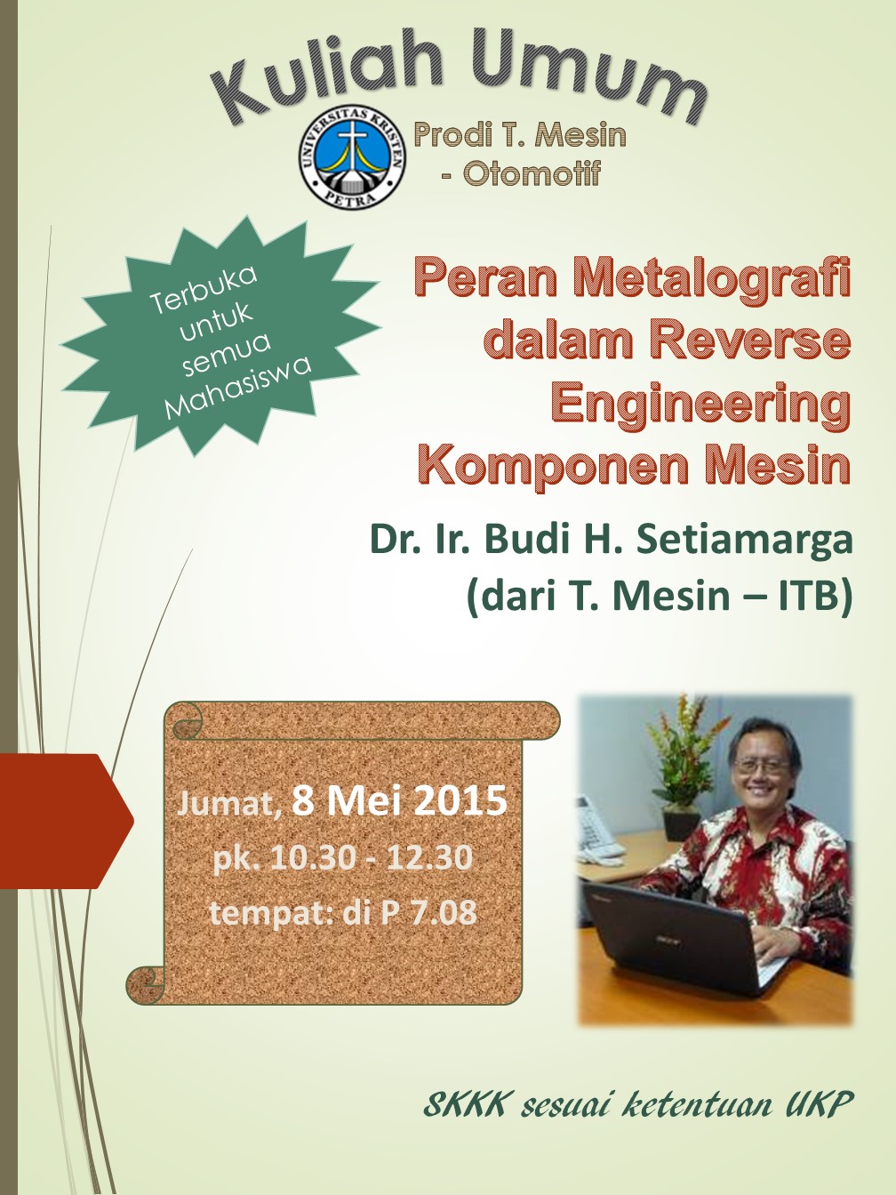 Kuliah Umum Prodi Teknik Mesin (Otomotif). Kuliah umum terbuka untuk semua mahasiswa, dan membahas “Peran Metakigrafi dalam Reverse Engineering Komponen Mesin” bersama bapak Dr. Ir. Budi H. Setiamarga ( dari teknik mesin – ITB). Kuliah umum dilaksanakan pada 8 Mei 2015 pada pukul 10.30-12.30 bertempat di gedung P lt. 7 ruangan P708.