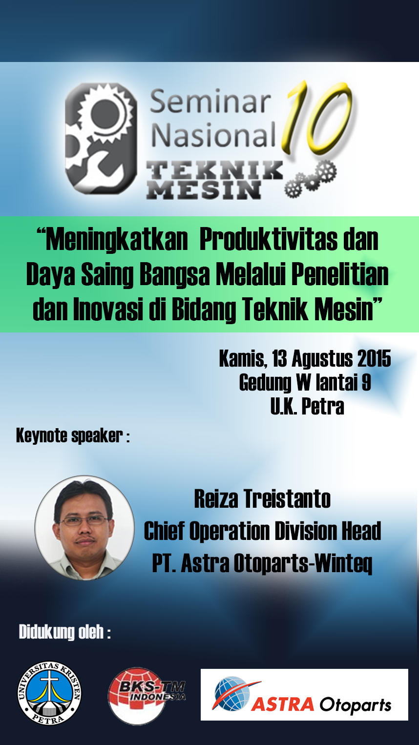 Seminar Nasional Teknik Mesin 10 dengan tema “Meningkatkan Produktivitas dan Daya Saing Bangsa Melalui Penelitian dan Inovasi di Bidang Teknik Mesin”, dilaksanakan pada hari Kamis, 13 Agustus 2015, bertempat di Gedung W lt. 9 UK Petra. Dalam seminar nasional ini menghadirkan Reiza Triestanto sebagai pembicara utama.