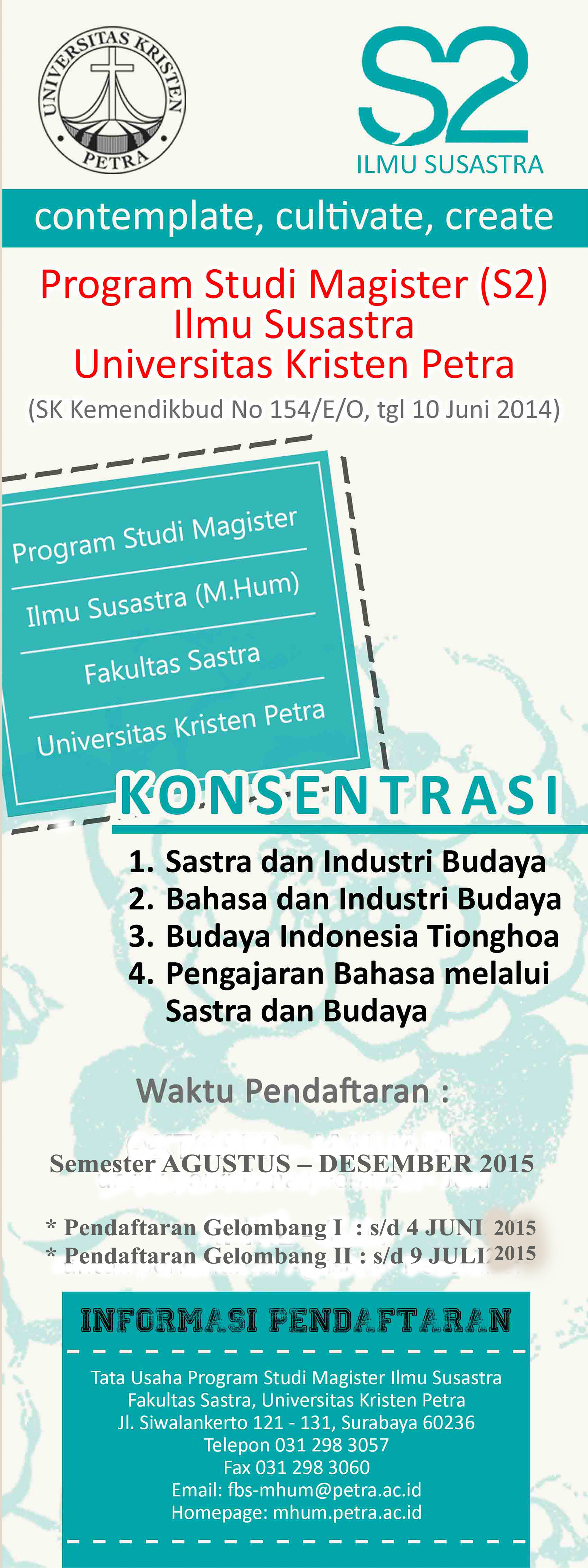 Program Studi Magister (S2) Ilmu Susastra Universitas Kristen Petra membuka pendaftaran penerimaan mahasiswa semester Februari – Juni 2-16. Program studi magister ilmu susastra ini menyediakan konsentrasi sastra dan industri budaya, bahasa dan industry budaya, budaya Indonesia Tionghoa, dan pengajaran bahasa melalui sastra dan budaya.