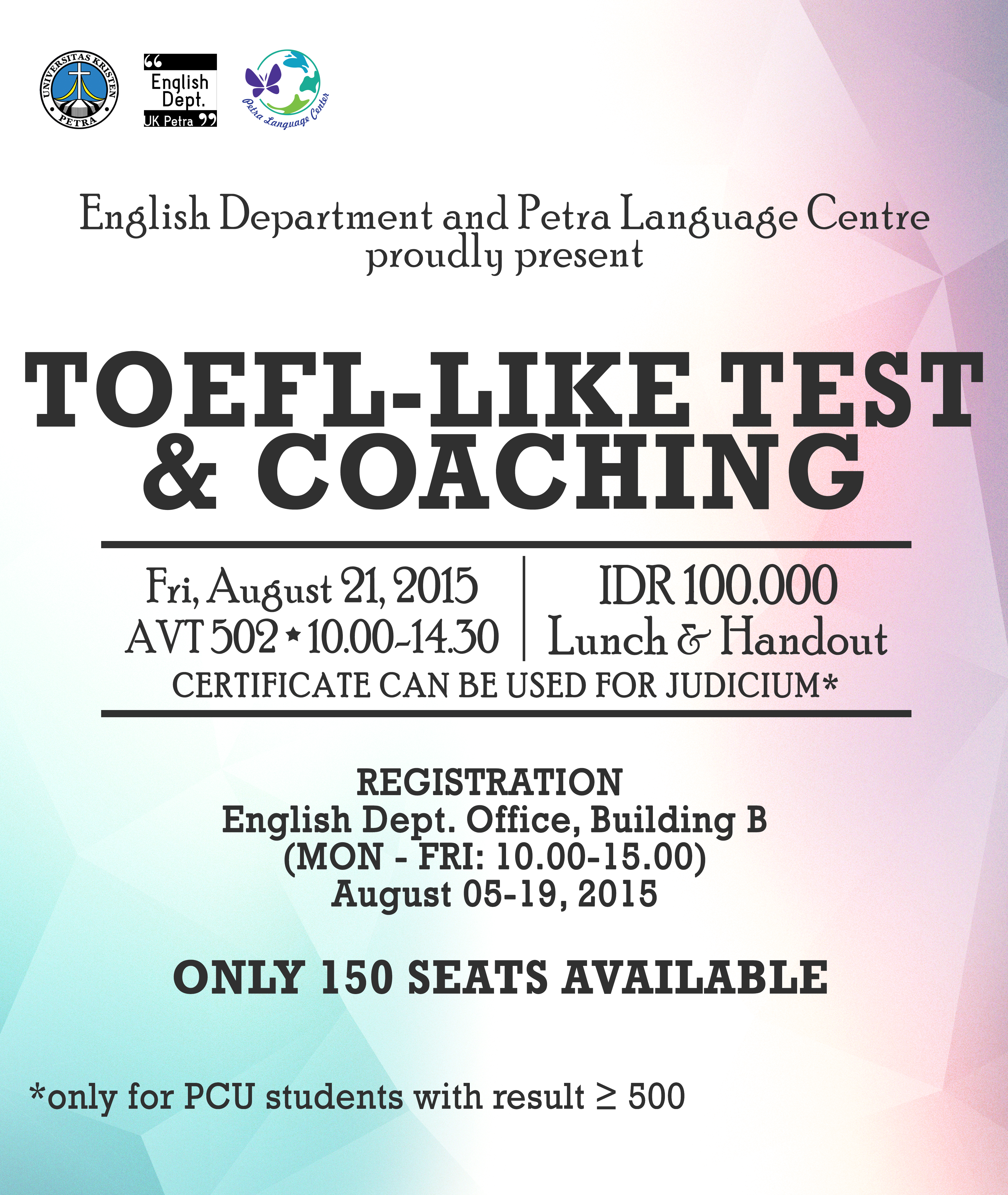 Program Studi Sastra Inggris dan PPB UK Petra, menyelenggarakan kegiatan dengan tema “Toefl-Like Test & Coaching”. Kegiatan tersebut dilaksanakan pada hari Jumat, 21 Agustus 2015 pada pukul 10.00-14.30 bertempat di AVT502. Peserta yang mengikuti kegiatan tersebut berhak mendapatkan sertifikat yang bisa digunakan sebagai syarat wisuda.