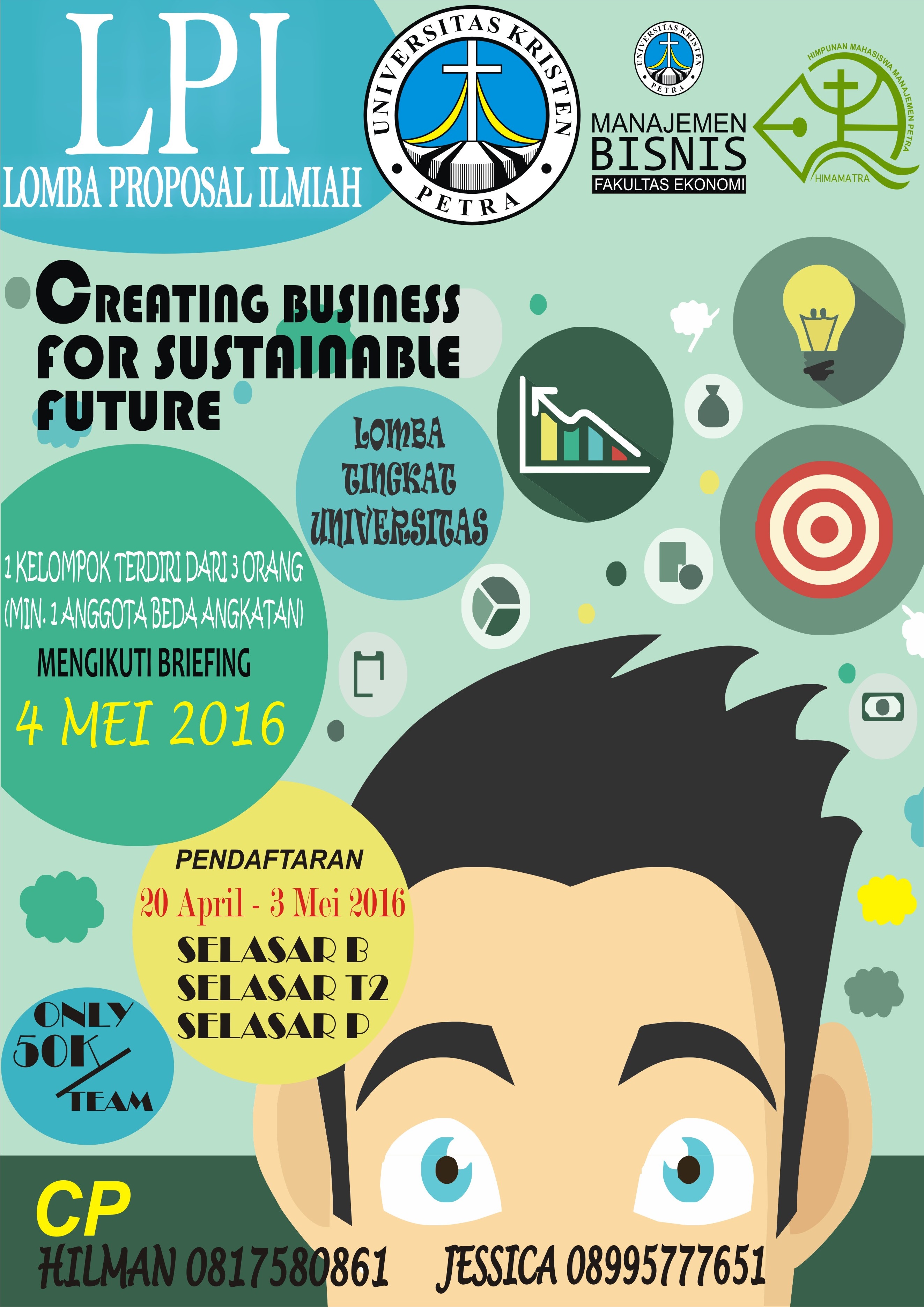Program Studi Manajemen Bisnis mengadakan acara lomba proposal ilmiah dengan tema Creating Business for Sustainable Future. 1 Team diisi oleh tiga orang minimal 1 orang harus beda angkatan. Dengan biaya 50 ribu untuk 1 tim.