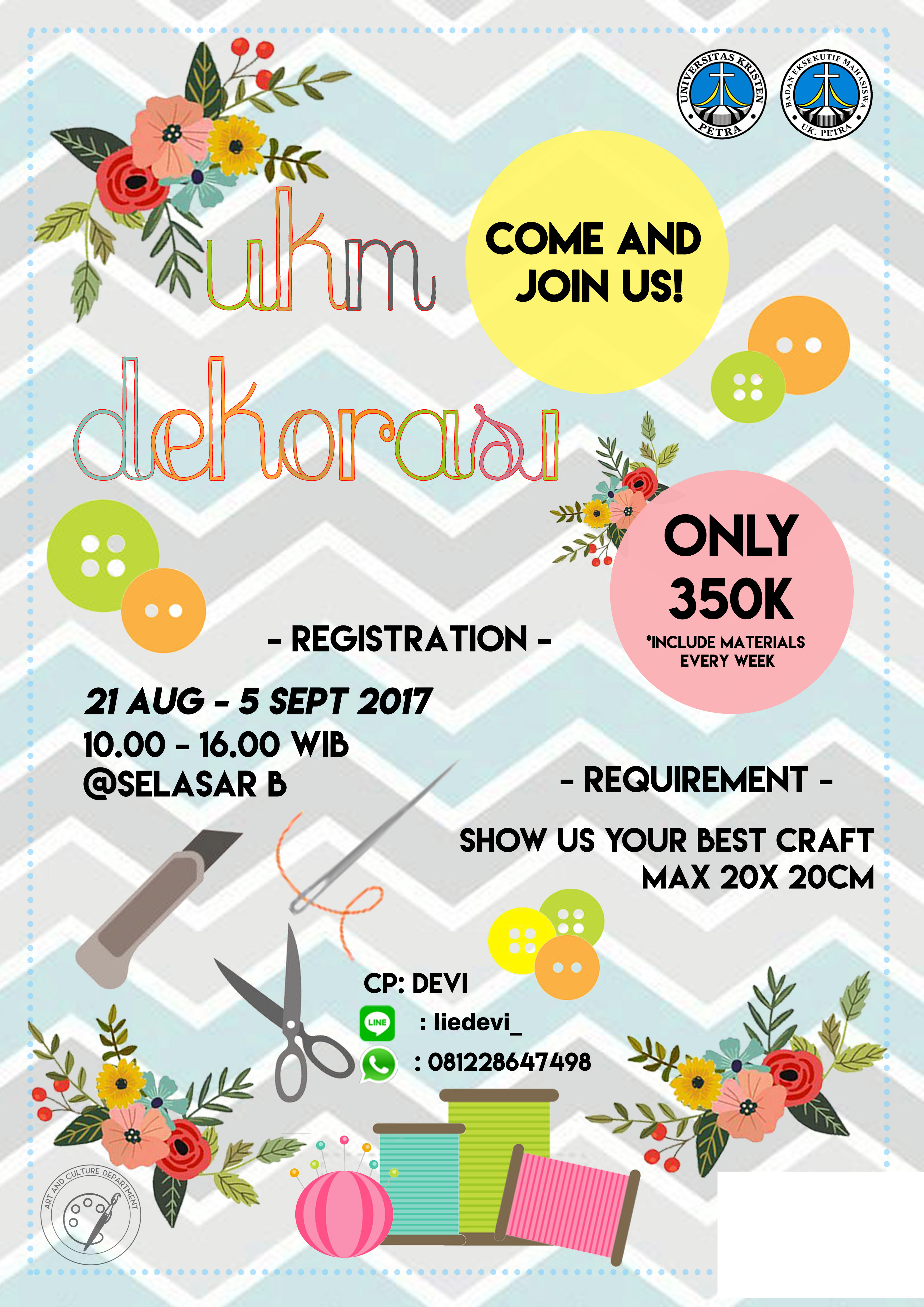 UKM Dekorasi Universitas Kristen Petra Surabaya membuka pendaftaran bagi mahasiswa petra untuk bergabung dalam anggota UKM Dekorasi. Pendaftaran dibuka pada tanggal 21 Agustus hingga 5 September 2017, di selasar gedung B.