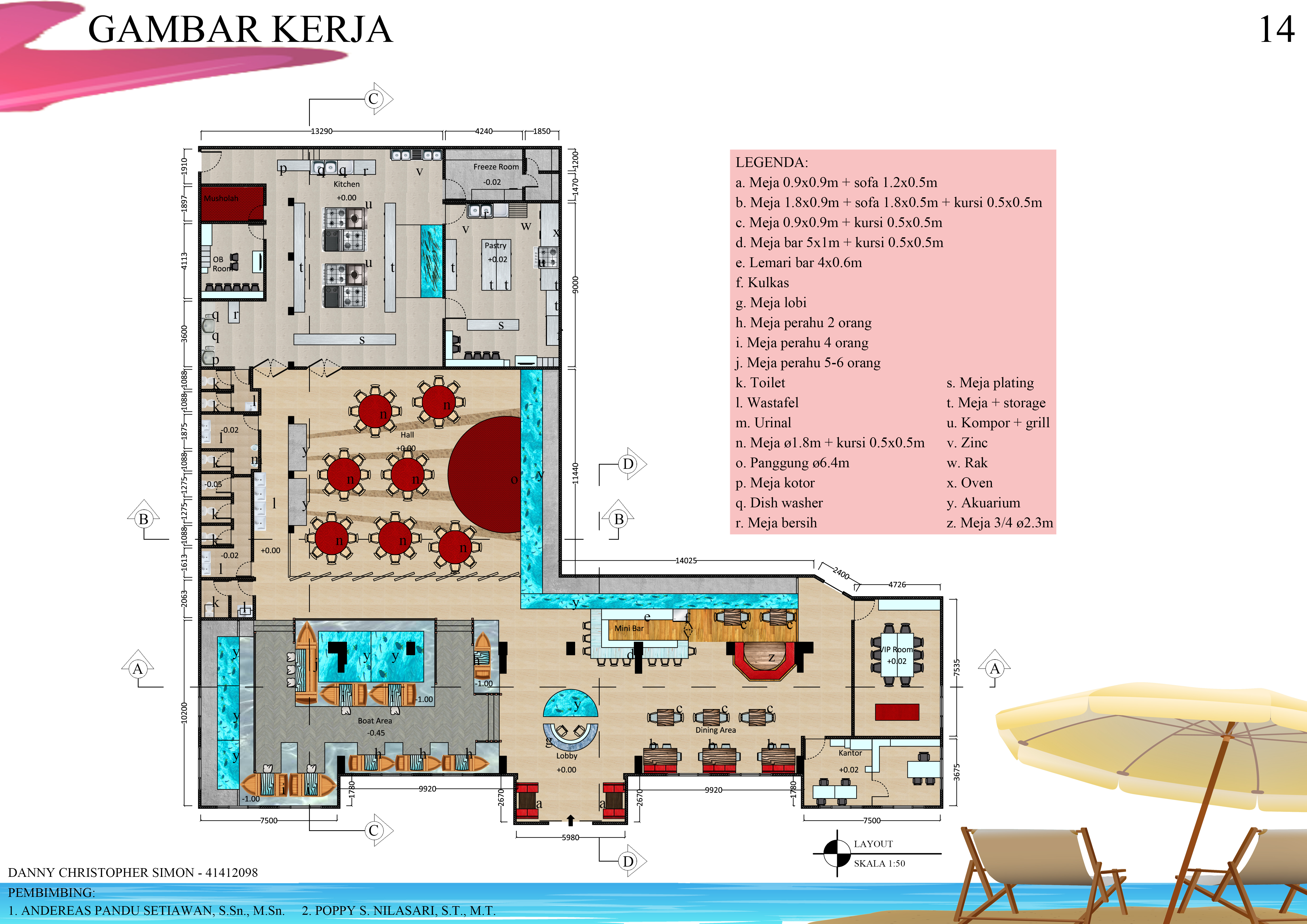 Makan adalah kebutuhan utama manusia, karena itu cukup banyak restoran yang dibangun di Surabaya, salah satunya restoran Mahameru. Restoran ini akan mengangkat kekayaan dan keindahahan laut Indonesia yang akan diterapkan pada interior dalam bentuk akuarium, dan dilengkapi dengan informasi jenis, populasi dan habitat ikan-ikan Indonesia. Restoran ini memiliki konsep yang terinspirasi dari laut dan gunung (logo Mahameru), sehingga menciptakan nama ”water eruption” yang akan memiliki bentuk dan warna seperti gunung dan biru, yang akan diaplikasikan pada lantai, dinding, dan plafon interior restoran Mahameru. Gaya desain yang akan digunakan adalah coastal style yang memiliki suasana hangatnya pantai yang didominasi warna biru dan material kayu alami, sehingga mendukung konsep yang telah terbentuk dan lebih memberikan suasana yang tematik pada interior Mahameru.