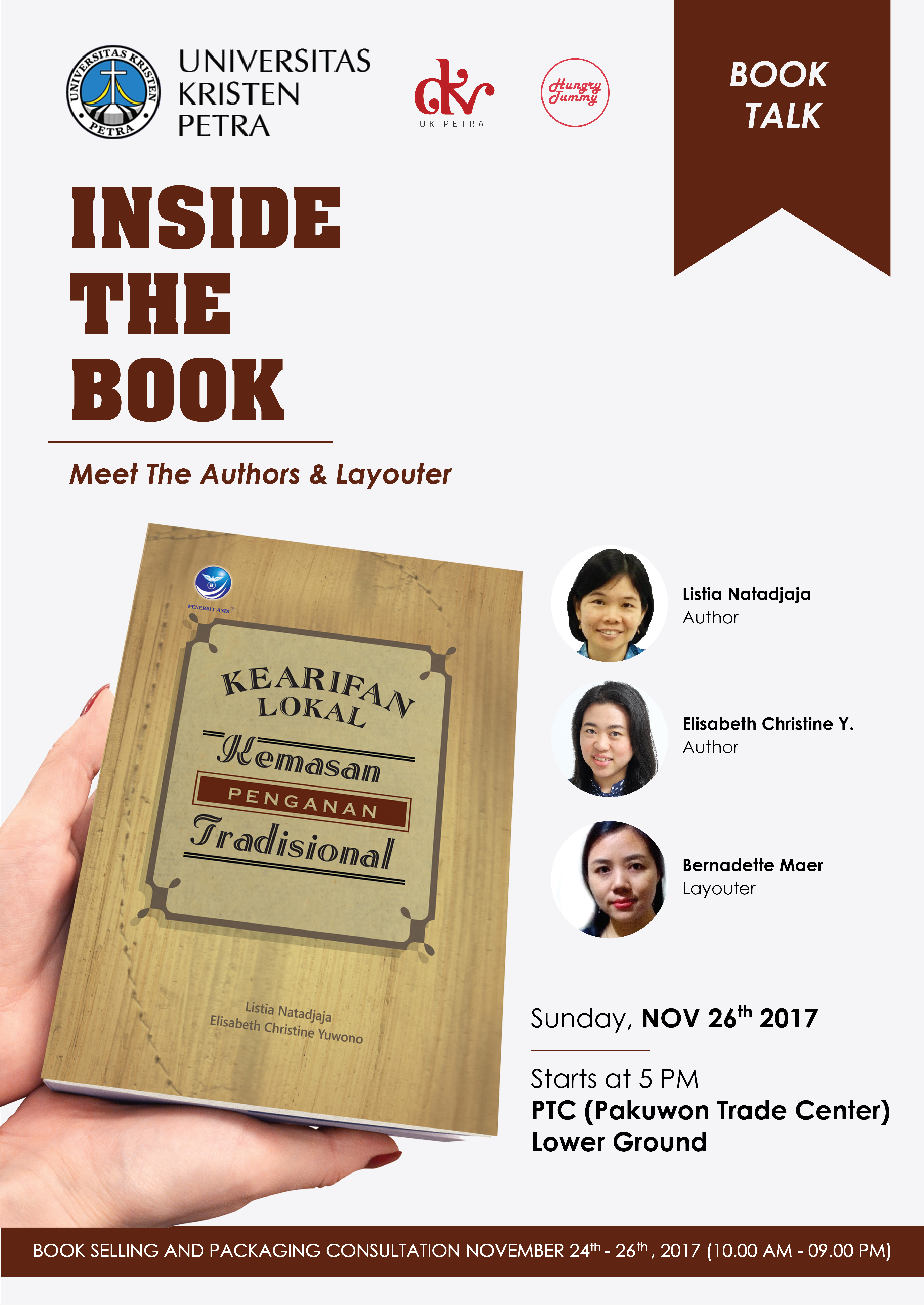 Fakultas Seni dan Desain Universitas kristen Petra Surabaya, mengadakan acara bedah buku yang berjudul " Kearifan lokal kemasan penganan tradisional". Acara ini juga dihadiri pengarang dan desainer buku tersebut. Diadakan pada 26 November 2017 bertempat di PTC Lower Ground.