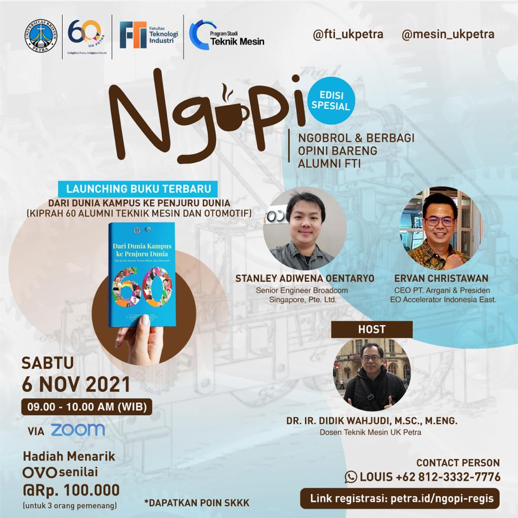 Ngopi: ngobrol dan berbagi opini bareng alumni FTI edisi khusus, akan dilaksanakan oleh Fakultas Teknologi Industri UK Petra pada tanggal 06 November 2021 jam 09.00 - 10.00 WIB melalui aplikasi Zoom. Bertindak sebagai narasumber ialah Stanley Adiwena Oentaryo dan Ervan Christawan dan bertindak sebagai host bapak Dr. Ir. Didik Wahjudi, M.Sc., M.Eng.