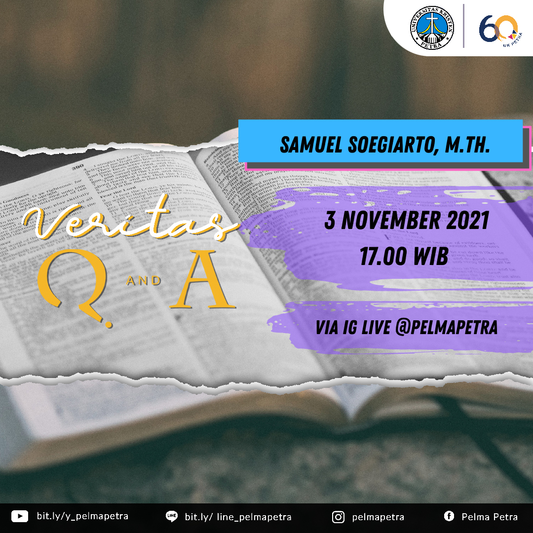 Pelayanan Mahasiswa mengadakan acara Veritas QnA pada tanggal 03 November 2021 jam 17.00 WIB. Dengan narasumber bapak Samuel Soegiarto, M.Th. Acara ini berlangsung secara daring melalui live IG@pelmapetra.