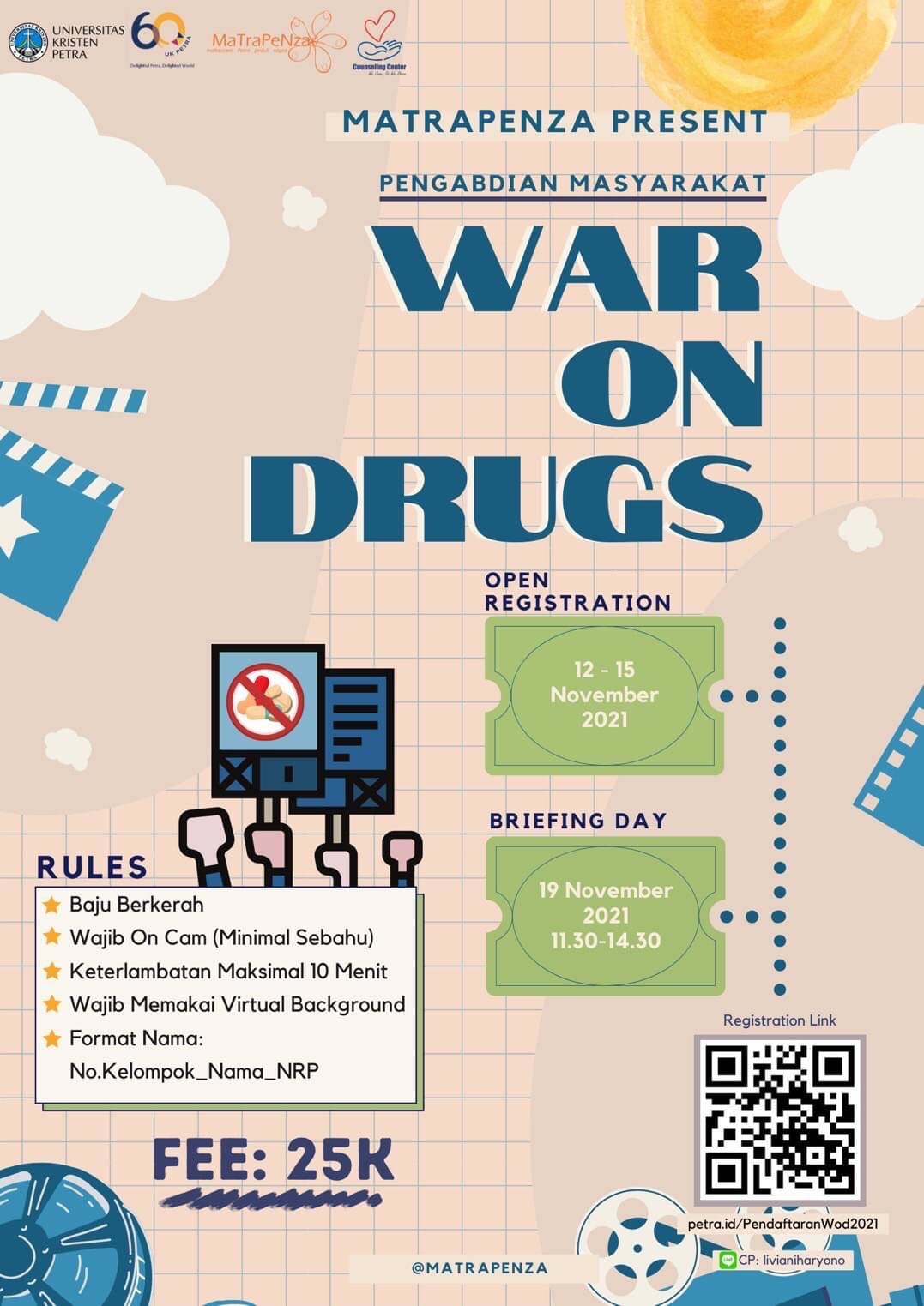 UKM Matrapenza akan mengadakan kegiatan pengabdian masyarakat dengan topik "war on drugs". Untuk pendaftaran peserta dibuka dari tanggal 12 - 15 November 2021 sedangkan untuk briefing acaranya pada tanggal 19 November 2021. Info lengkap bisa dilihat di http://petra.id/PendaftranWod2021