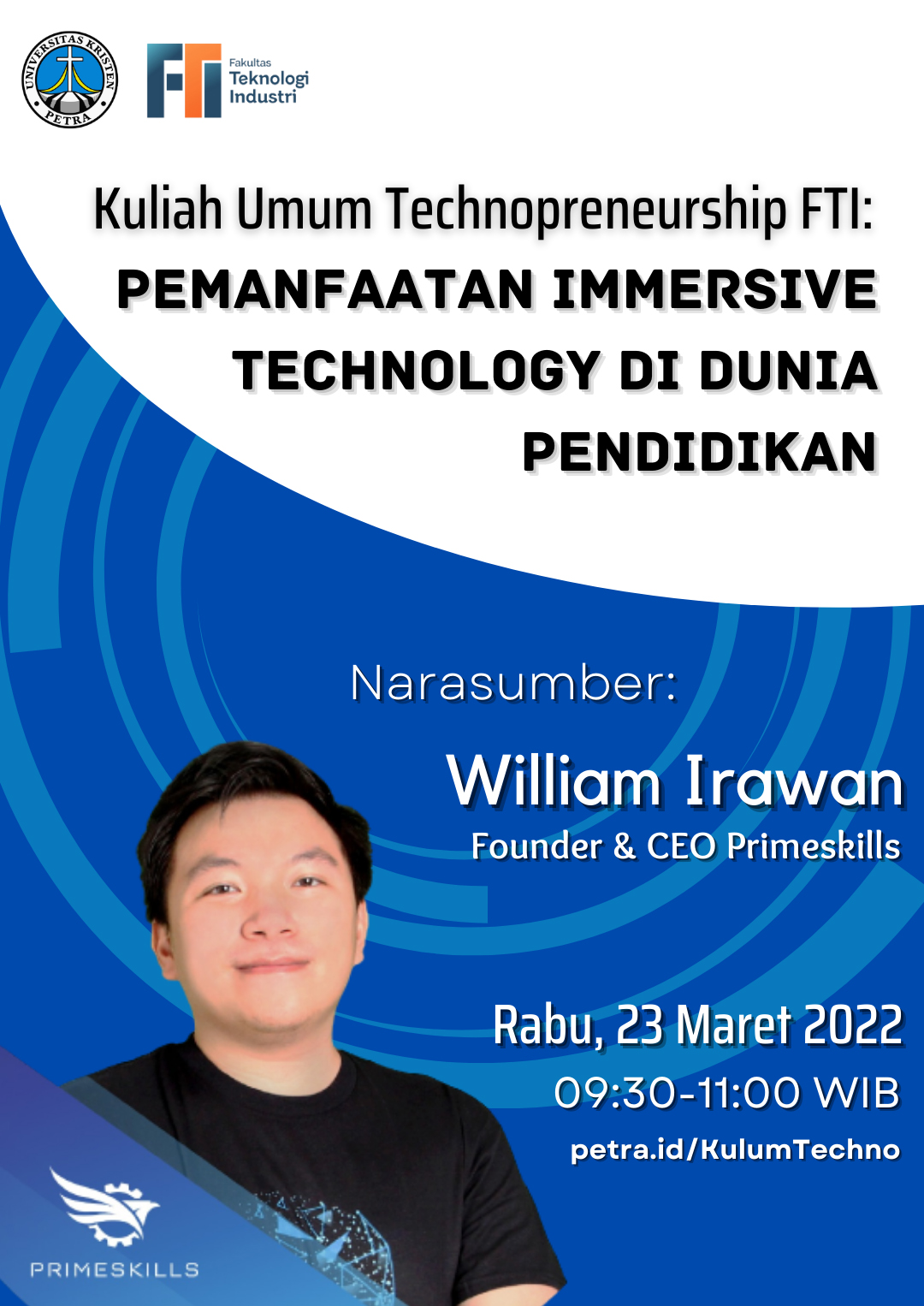 Fakultas Teknologi Industri Universitas Kristen Petra pada tanggal 23 Maret 2022 jam 09.30 -11.00 WIB, mengadakan acara Kuliah umum technopreneurship FTI : pemanfaatan immersive technology di dunia pendidikan. Dengan narasumber William Irawan, untuk informasi selengkapnya bisa dilihat di petra.id/KulumTechno
