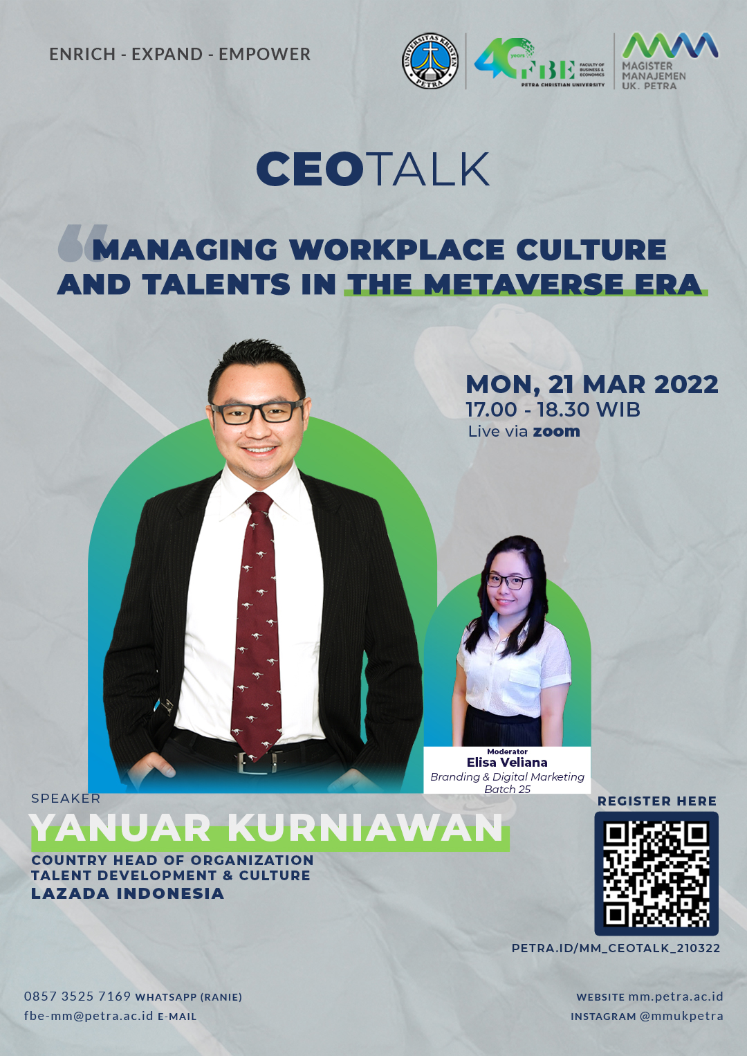 Ceo talk: managing workplace culture and talents in the metaverse era diadakan oleh Program Studi Magister Manajemen UK Petra Surabaya pada tanggal 21 Maret 2022 jam 17.00 - 18.30 WIB dengan narasumber bapak Yanuar Kurniawan dari Lazada Indonesia. Acara ini akan dilangsungkan secara online melalui aplikasi Zoom. Info pendaftaran bisa dilihat di petra.id/mm_ceotalk_210322