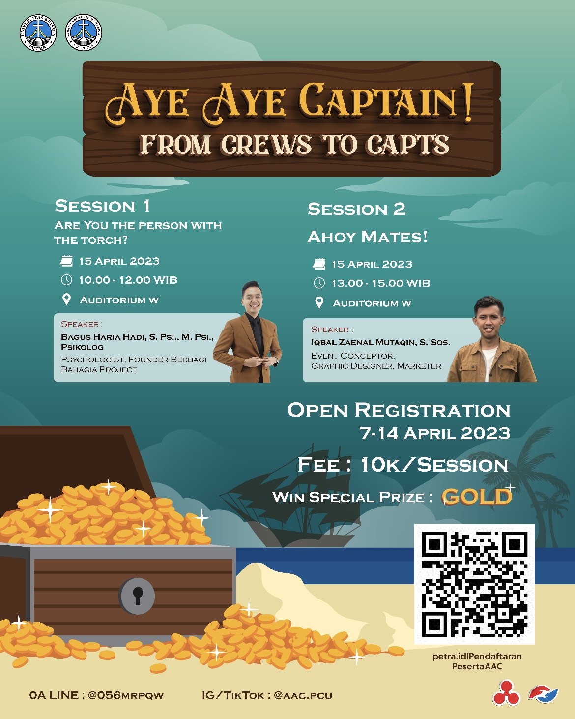 Aye Aye Captain adalah workshop yang diadakan oleh BEM UK Petra Surabaya. Workshop Aye Aye Captain akan membicarakan dan menjelaskan gimana sih jadi kapten yang baik. Acara ini diselenggarakan pada 15 April 2023 jam 10.00 -15.00 WIB, bertempat di Auditorium kampus Pusat UK Petra. Dengan menghadirkan Bagus Haria Hadi, M.Psi., dan Iqbal Zaenal Mutaqin, S.Sos., sebagai pembicara.