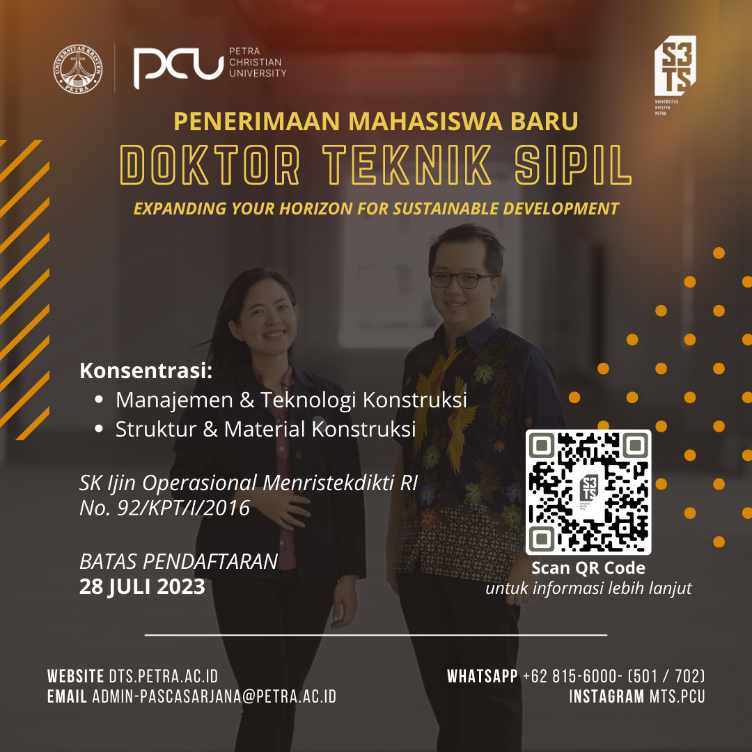 Program Studi Doktor Teknik Sipil UK Petra Surabaya, membuka pendaftaran mahasiswa baru tahun 2023. Pendaftaran dibuka hingga tanggal 28 Juli 2023.