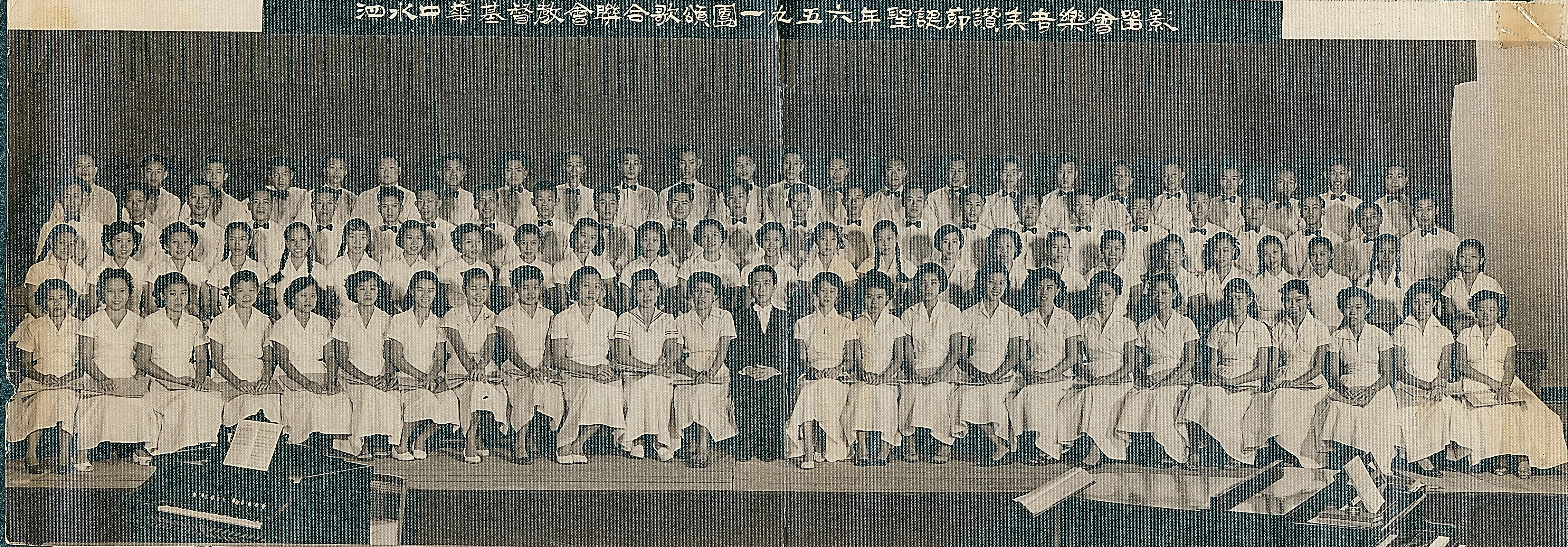 Paduan suara Gereja Tionghoa (Tiong Hoa Kie Tok Kauw Hwee - THKTKH) gabungan dari dialek Hokkien/Amoy, Guangdong/Kanton, Hinhwa, dan Foochow/Fuzhou dipimpin oleh Wang Teng Kauw (Huang Deng Gao). Baris paling belakang dari kiri ke kanan: no. 2 adalah Solomon Tong dan no. 4 Pdt. Stephen Tong. Baris paling depan, paling kanan kakak perempuan Pdt. Stephen Tong, yaitu Tang Chong Hua (foto tahun 1956)