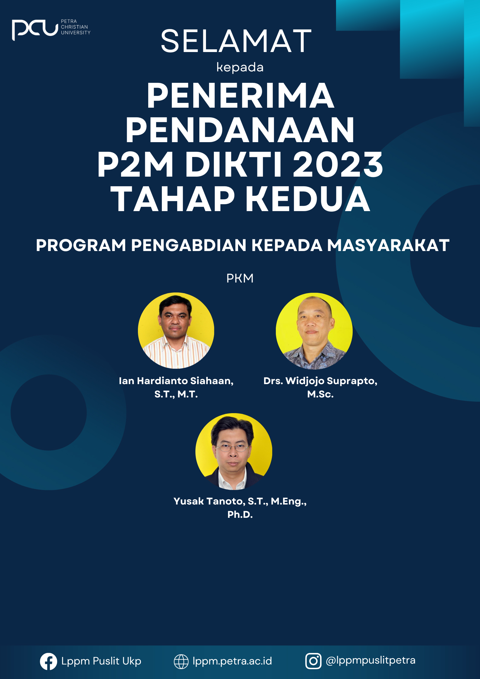 Selamat kepada Penerima Pendanaan P2M DIKTI tahun anggaran 2023 Tahap Kedua Program PKM. Penerima dana hibah kali ini yaitu Yusak Tanoto, Ph.D. dan Ian Hardianto Siahaan, M.T. serta Widjojo Suprapto, M.Sc.