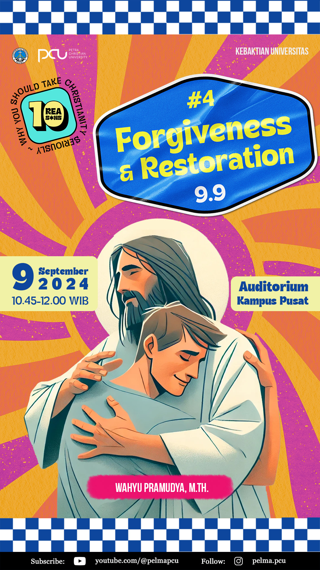 Dalam dunia ini, dilukai dan melukai adalah bagian yang tak terpisahkan dari kehidupan. Berbagai pandangan menawarkan cara untuk menyelesaikan keadaan keterlukaan, baik dengan cara membalas atau dengan cara mengabaikan. Pertanyaannya, bagaimana tawaran kekristenan (Injil) dalam hal ini? Apa yang membedakan dari tawaran Injil, yang lebih menarik dibandingkan dengan tawaran lainnya. Kebaktian Universitas setiap Senin, kembali diadakan. Pada hari Senin, 09 September 2024 bertempat di Auditorium kampus Pusat dengan tema Kebaktian universitas: forgiveness & restoration. Dengan pembicara Wahyu Pramudya M.Th.