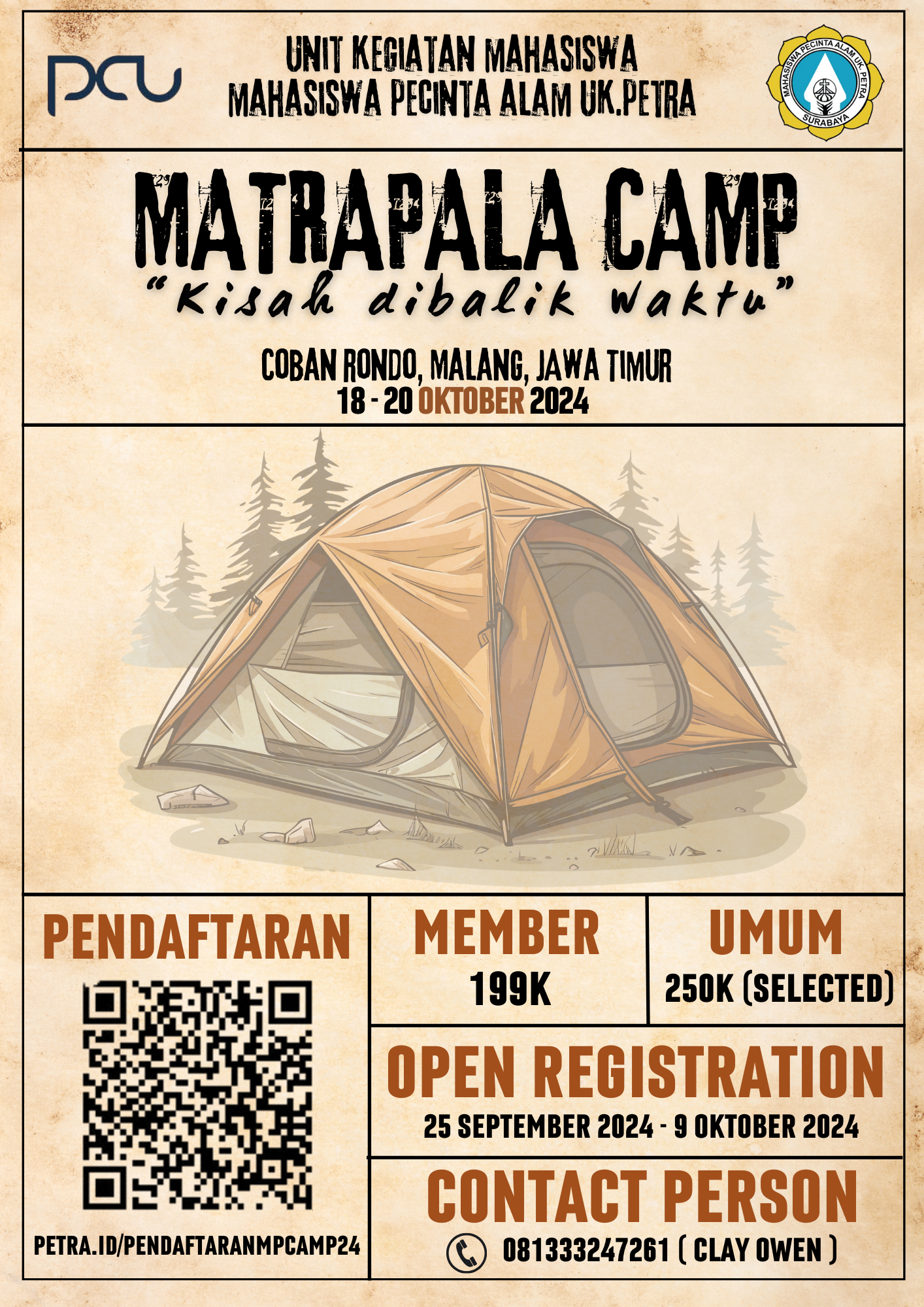 MATRAPALA CAMP adalah kegiatan camping ceria selama 3 hari 2 malam untuk memperkenalkan materi dan kegiatan-kegiatan menarik yang ada di MATRAPALA sekaligus waktu bonding bersama. Kegiatan dilaksanakan pada 18-20 Oktober 2024 bertempat di Coban Rondo, Malang.