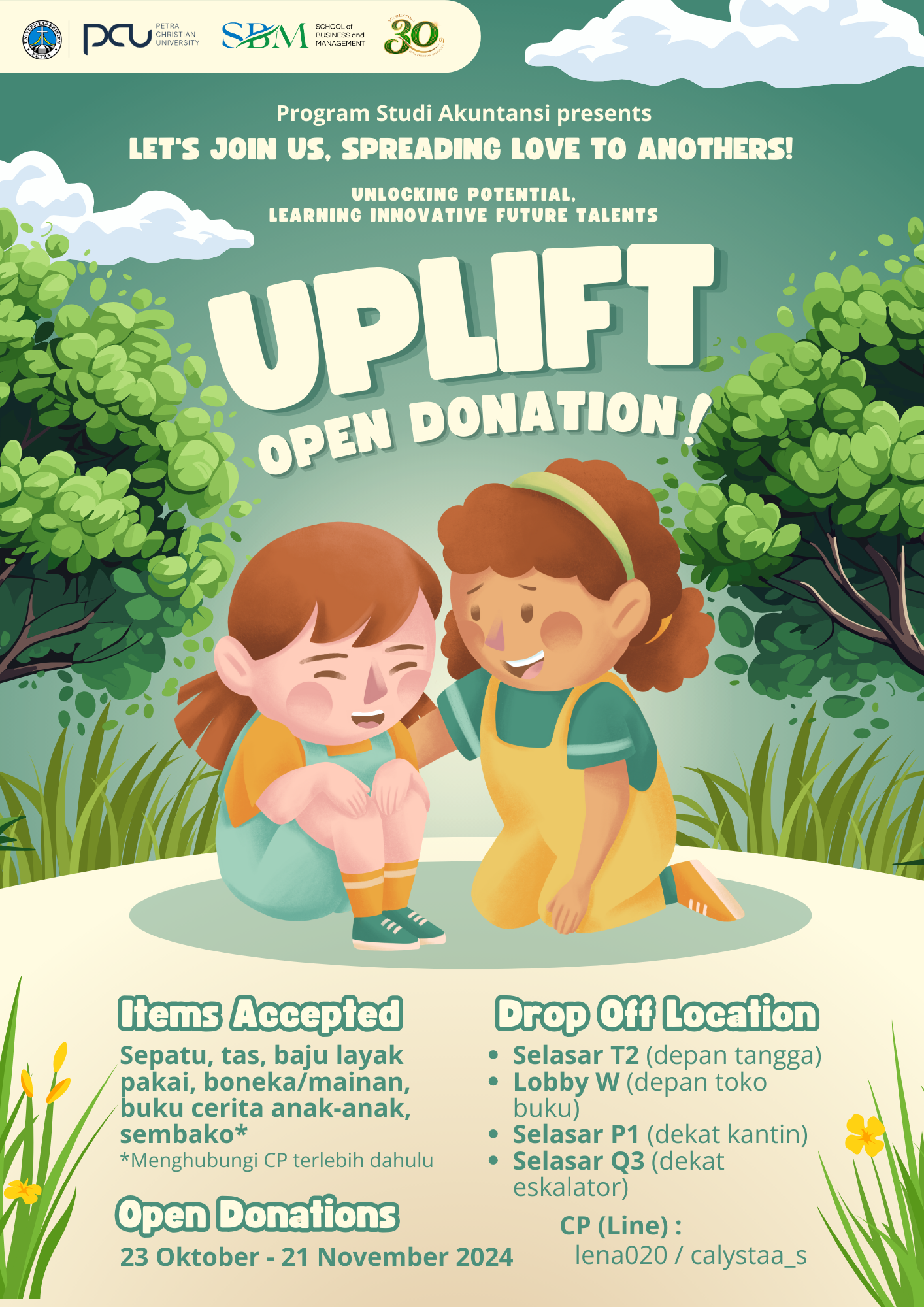 Uplift merupakan sebuah acara pengabdian masyarakat di sebuah panti asuhan yang ada di Surabaya. Melalui kegiatan ini, kami membuka donasi berupa barang layak pakai dan sembako. Pengumpulan barang-barang dilaksanakan pada 23 Oktober 2024 - 21 November 2024.