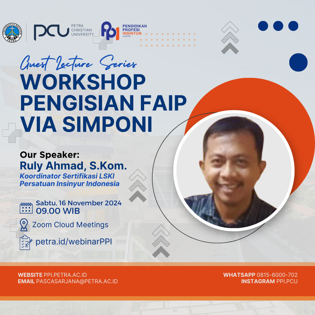 Program Pendidikan Profesi Insinyur Universitas Kristen Petra Surabaya pada Sabtu, 16 November 2024 Jam 09.00 - selesai mengadakan acara kuliah tamu dengan topik: Workshop Pengisian FAIP via SIMPoNI bersama narasumber Ruly Ahmad, S.Kom.Koordinator Sertifikasi LSKI Persatuan Insinyur Indonesia. Untuk informasi selengkapnya ada di Link registrasi: petra.id/webinarPPI.