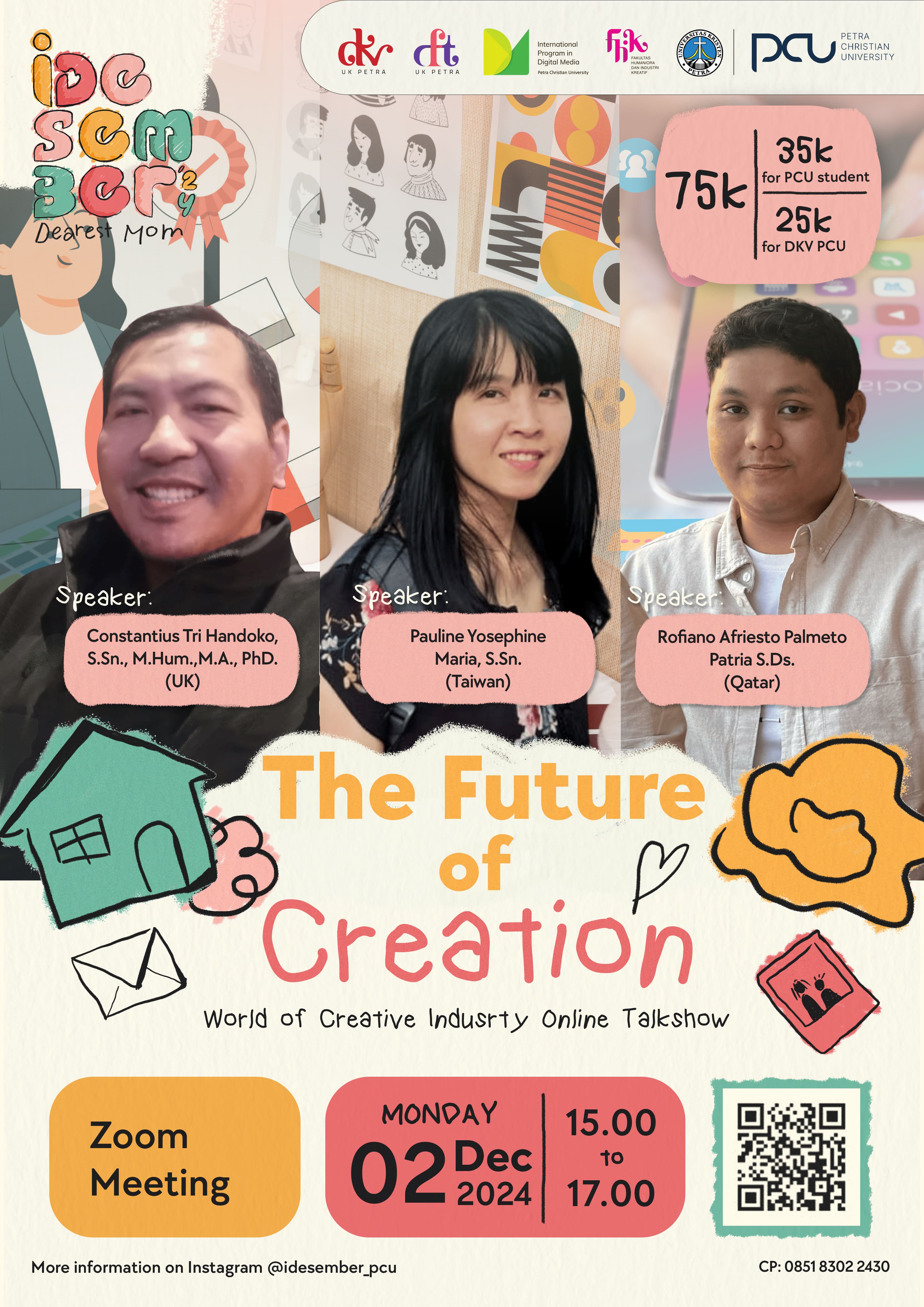 Program Studi Desain Interior Universitas Kristen Petra Surabaya pada tanggal 02 Desember 2024 jam 15.00 - 17.00 WIB mengadakan acara tentang World of creative industry online talkshow: the future of creation. Dengan narasumber Constantius Tri Handoko, Ph.D. dan Pauline Yosephine Maria, S.Sn. dan Rofiano Afriesto Palmeto Patria S.Ds.