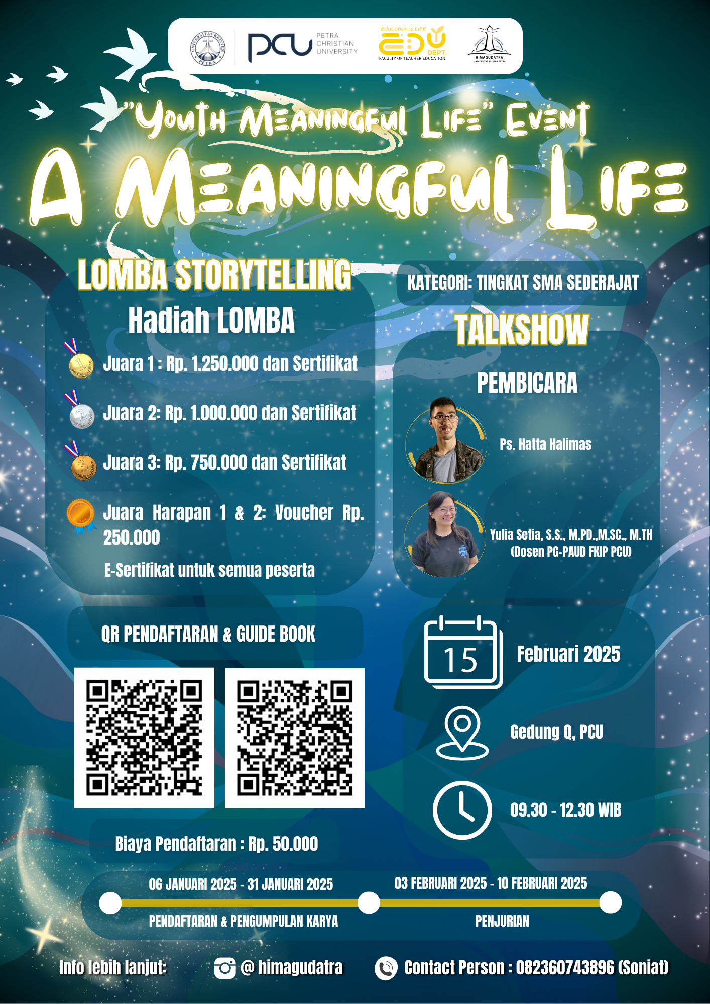 Punya bakat bercerita yang memukau? Yuk, tunjukkan kemampuanmu di Lomba Storytelling Youth Meaningful Life Event 2025 yang diadakan oleh Fakultas Keguruan Ilmu Pendidikan (FKIP) Petra Christian University! 🌟
