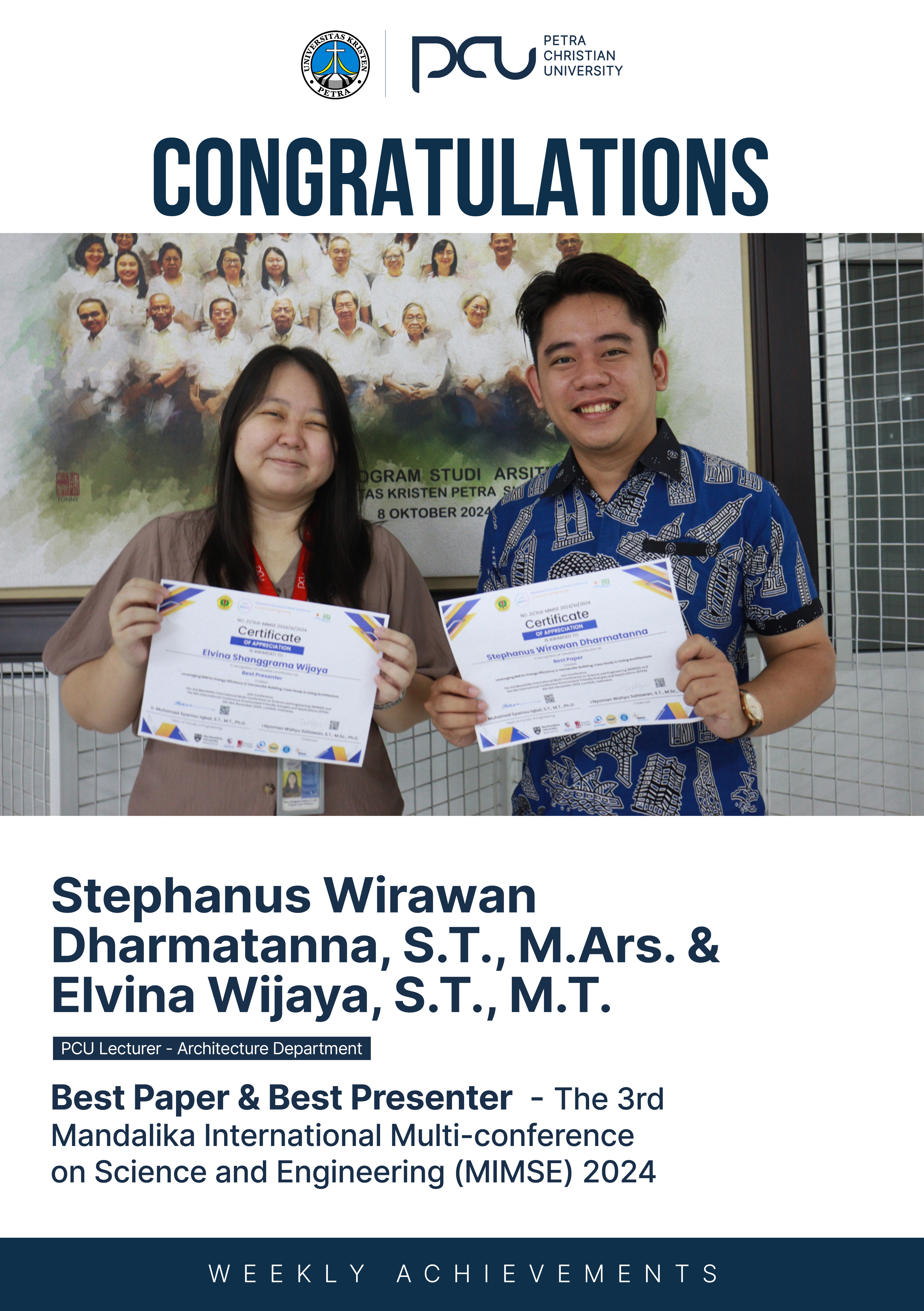 Selamat atas prestasi yang diraih Stephanus Wirawan, Dharmatanna, S.T., M.Ars., Elvina Wijaya, S.T., M.T.