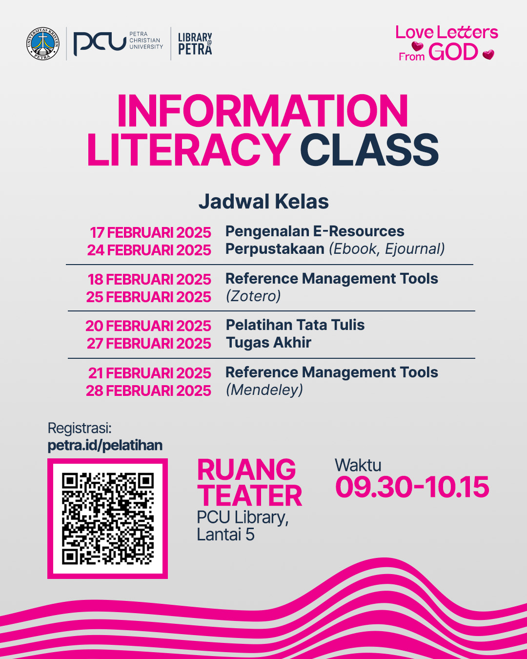 Perpustakaan UK Petra Surabaya kembali membuka kelas literasi bagi mahasiswa UK Petra. Pelatihan diselenggarakan di Ruang Theater Kampus Pusat. Untuk info lebih lanjut bisa dilihat di petra.id/pelatihan