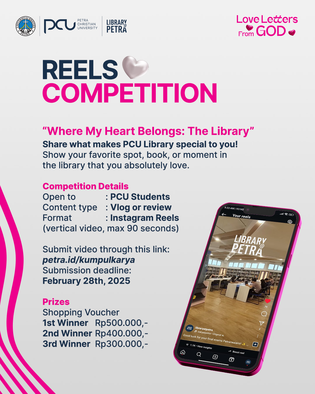 Perpustakaan Universitys Kristen Petra Surabaya, mengadakan lomba bikin video reels. Untuk informasi lengkap bisa di lihat di petra.id/kumpulkarya, dengan deadline 28 Februari 2025