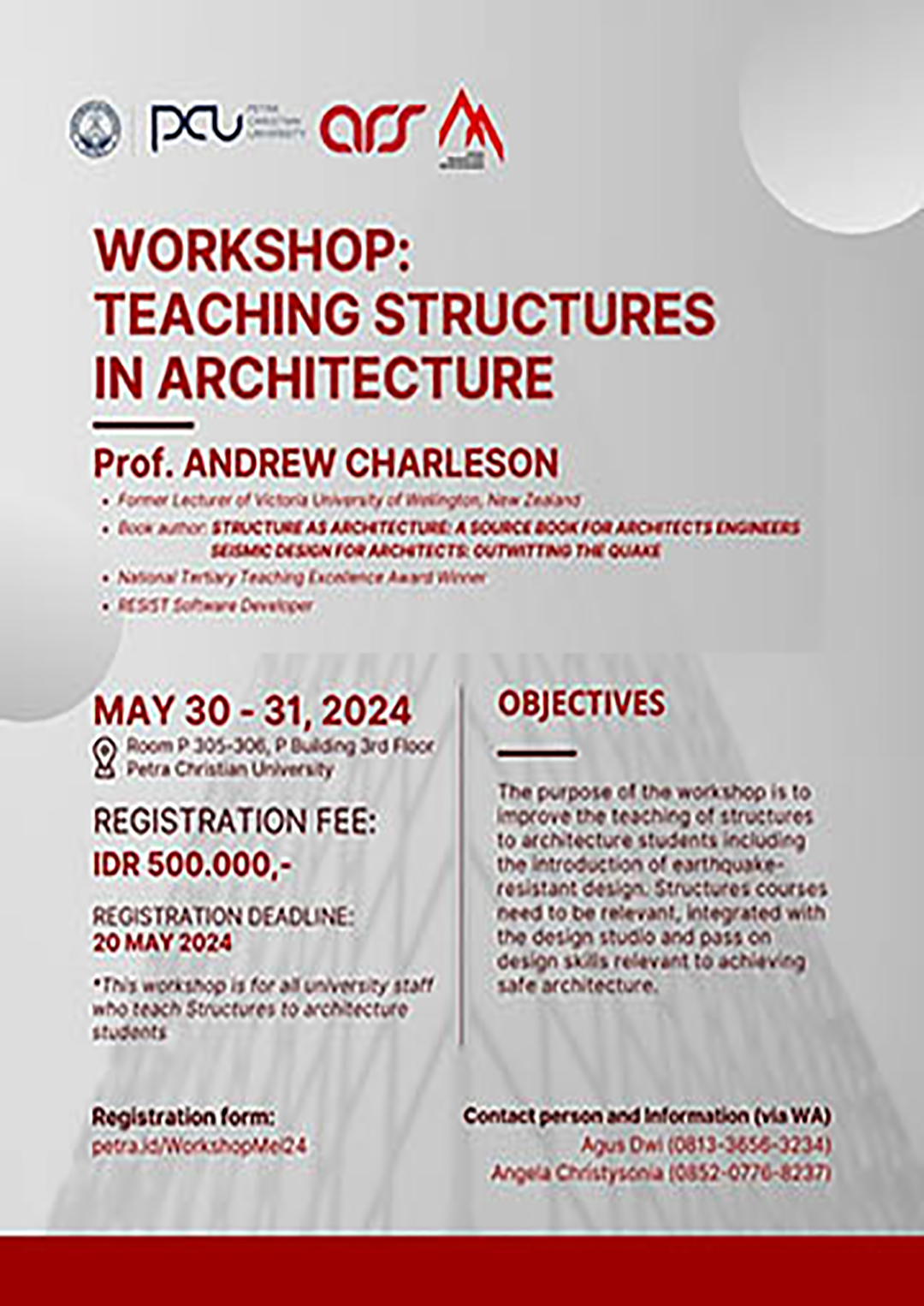 Workshop: teaching structures in architecture diselenggarakan oleh Program Studi Teknik Arsitektur Universitas Kristen Petra Surabaya pada 30-31 Mei 2024, ditempat di Gedung P.305. Dengan narasumber Prof. Andrew Charleson.