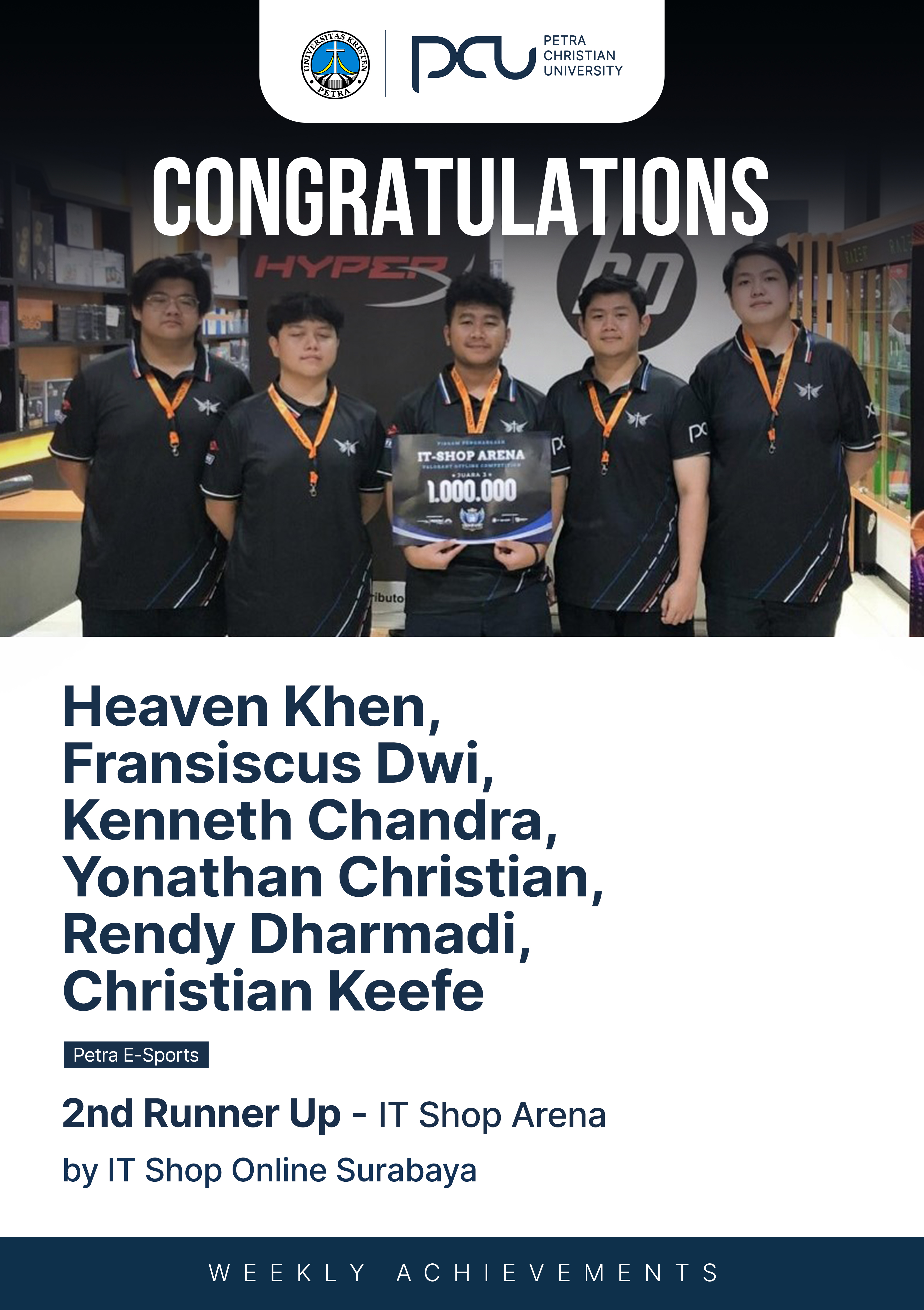 Selamat atas prestasi yang diraih oleh Heaven Khen, Fransiscus Dwi, Kenneth Chandra, Yonathan Christian, Rendy Dharmadi, Christian Keefe sebagai 2nd Runner Up dalam IT Shop Arena by IT Shop Online Surabaya