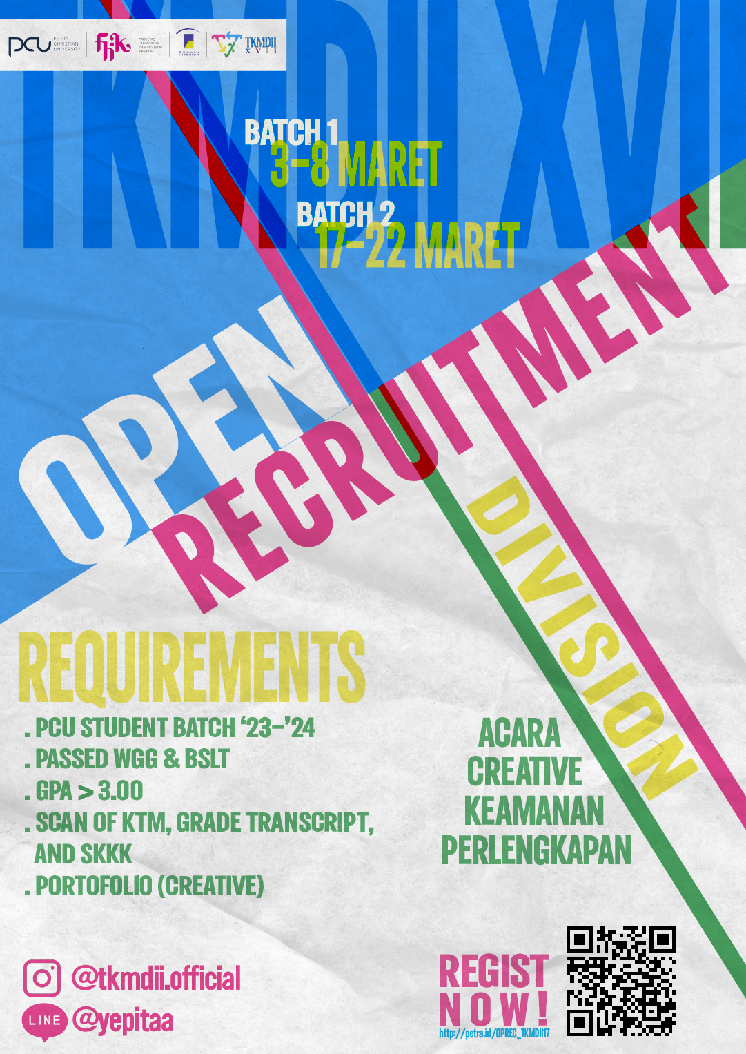 Temu Karya Mahasiswa Desain Interior Indonesia (TKMDII XVII), merupakan sebuah acara yang mempertemukan mahasiswa/i desain interior dari seluruh Indonesia untuk bersama-sama menampilkan karya dan membuat karya bersama untuk masyarakat. Untuk memperlancar acara tersebut maka dibuka kesempatan untuk menjadi panitia dalam acara ini, pendaftaran untuk menjadi panitia dibuka pada tanggal 03 - 22 Maret 2025.