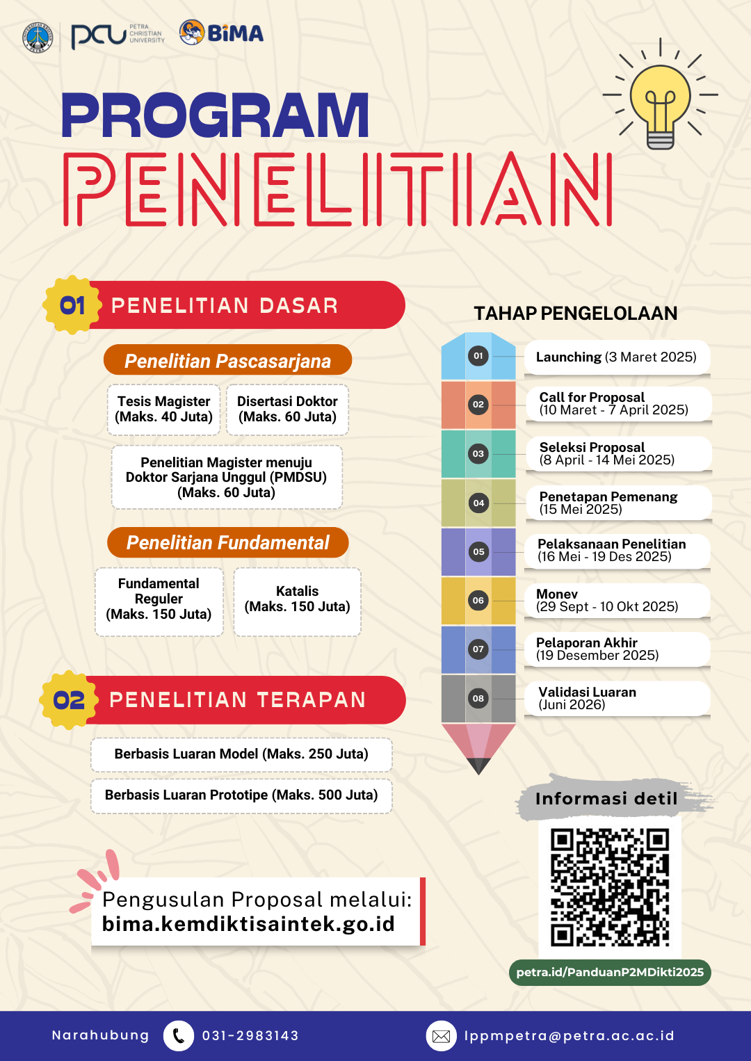 Kementerian Pendidikan Tinggi, Sains, dan Teknologi (Kemdiktisaintek) melalui Direktorat Penelitian dan Pengabdian kepada Masyarakat Direktorat Jenderal Riset dan Pengembangan secara resmi meluncurkan Program Penelitian dan Pengabdian kepada Masyarakat Tahun 2025. Program pendanaan kompetitif ini akan dibuka mulai 10 Maret hingga 14 April 2025. Pengusulan proposal dilakukan melalui platform Basis Informasi Penelitian dan Pengabdian kepada Masyarakat (BIMA).