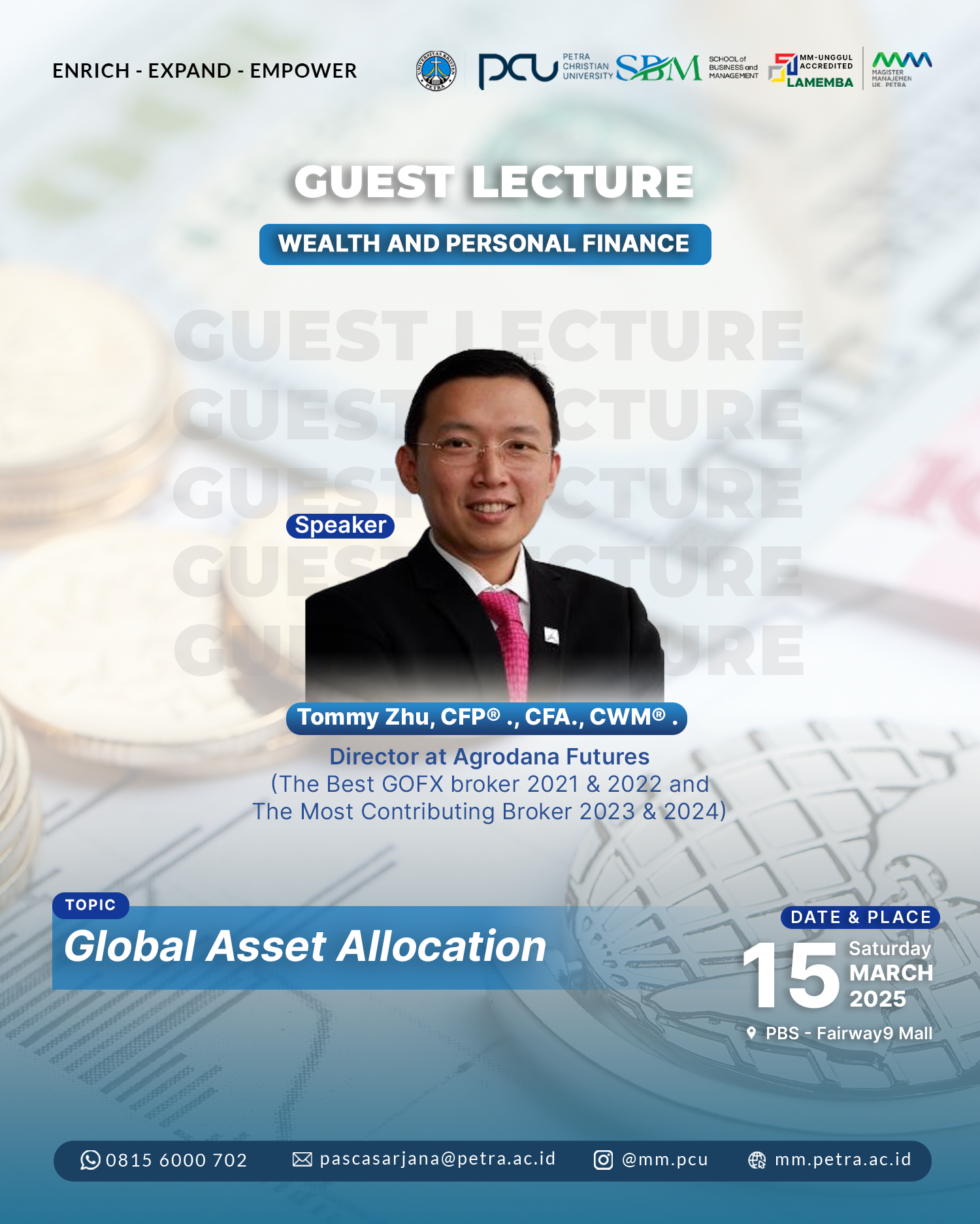 Pada tanggal 15 Maret 2025 Program Studi Magister Manajemen Universitas Kristen Petra Surabaya menyelenggarakan kuliah tamu dengan topik Wealth and Personal Finance dengan narasumber Tommy Zhu.