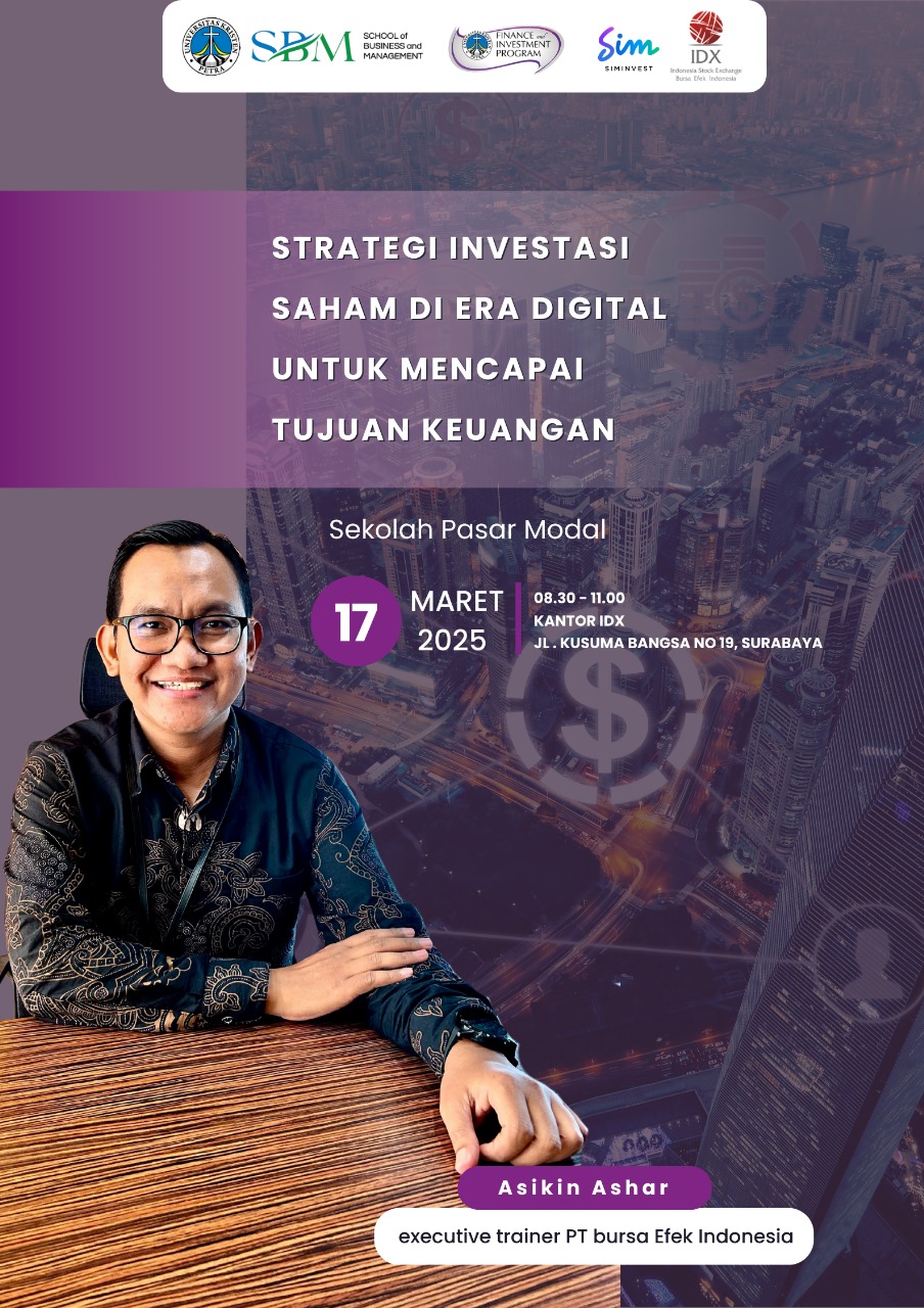 Sekolah pasar modal hasil kerjasama antara Finest, IDX dan Sinarmas Sekuritas akan diselenggarkan oleh Program Manajemen UK Petra pada 17 Maret 2025 jam 08.30 -11.00 WIB dengan narasumber bapak Asikin Ashar. Bertempat di kantor IDX jalan Kusuma Bangsa 19 Surabaya.