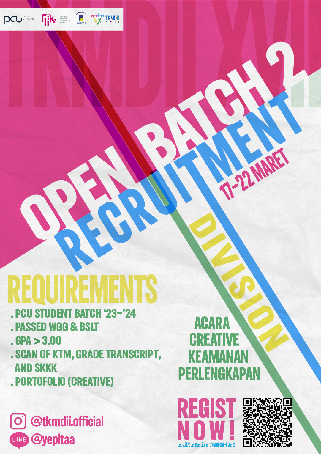 TKMDII XVII (Temu Karya Mahasiswa Desain Interior Indonesia ke-17). Merupakan acara yang mengumpulkan mahasiswa desain interior dari seluruh Indonesia untuk bersama-sama berkarya; Rangkaian acara berupa seminar, guest lecture, pameran, fieldtrip, dll. Sehubungan dengan hal tersebut, Progdi Desain INterior UK Petra Membuka kesempatan bagi mahasiswa Desain Interior UK Petra untuk bergabung dalam kepanitiaan acara ini. Pendaftaran dibuka hingga tanggal 22 Maret 2025.