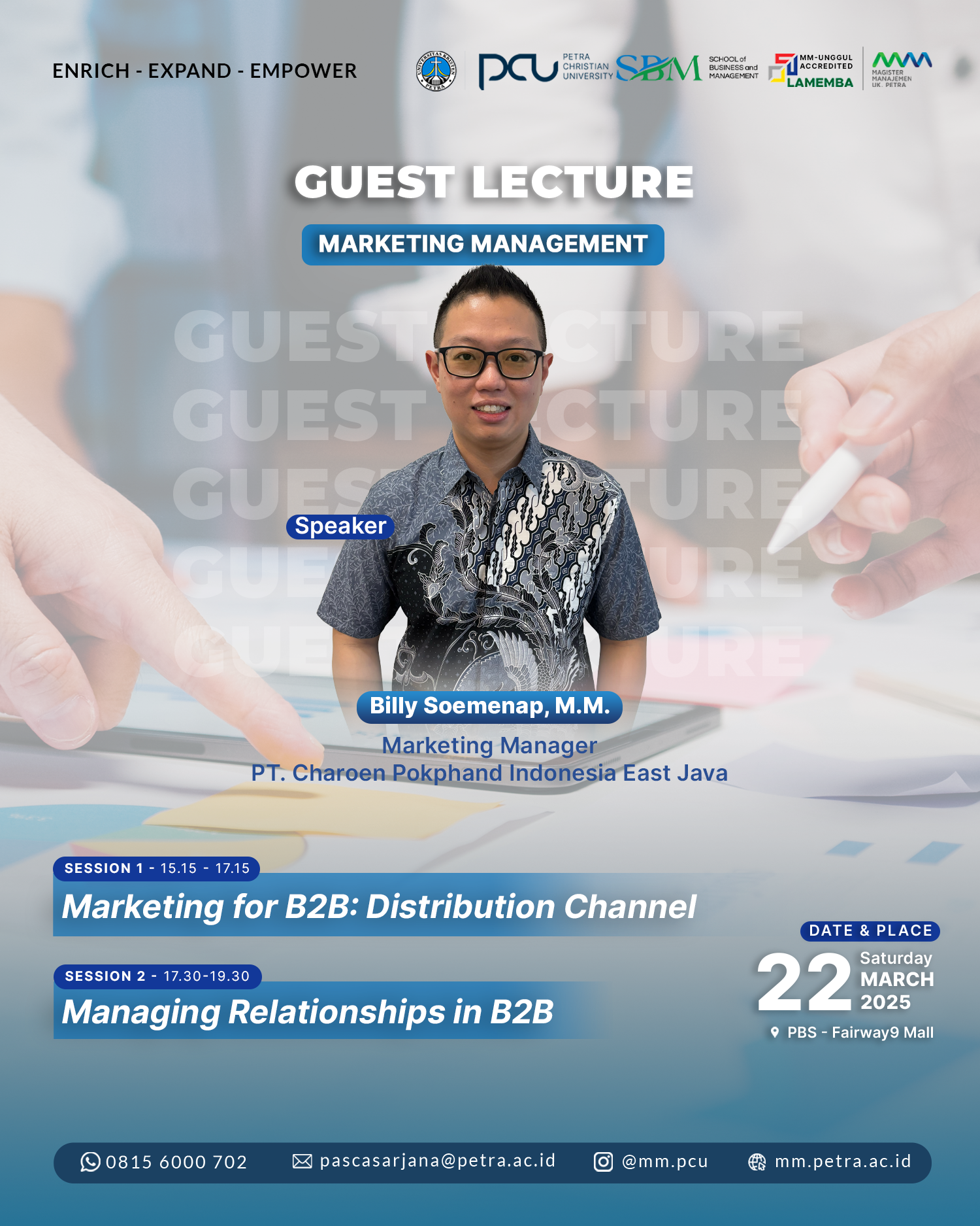 Sabtu, 22 Maret 2025 bertempat di Fairway9 Mall Surabaya, Program Studi Magister Manajemen UK Petra mengadakan kuliah tamu Marketing Management dengan narasumber Billy Soemenap, M.M.