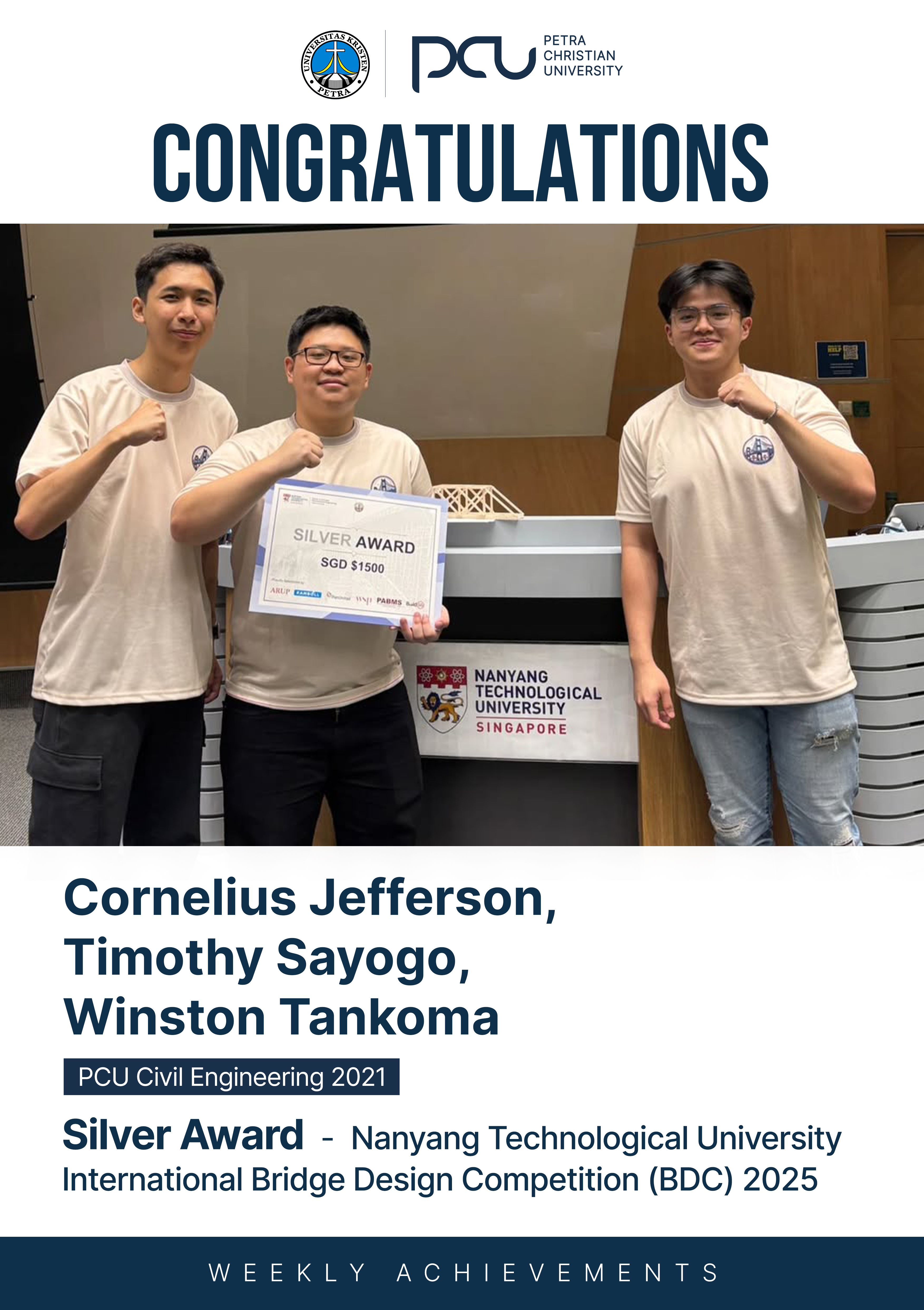 Selamat atas prestasi yang diraih oleh Cornelius Jefferson dan Timothy Sayogo, Winston Tankoma sebagai Silver Award dalam International Bridge Design Competition 2025 by Nanyang Technological University