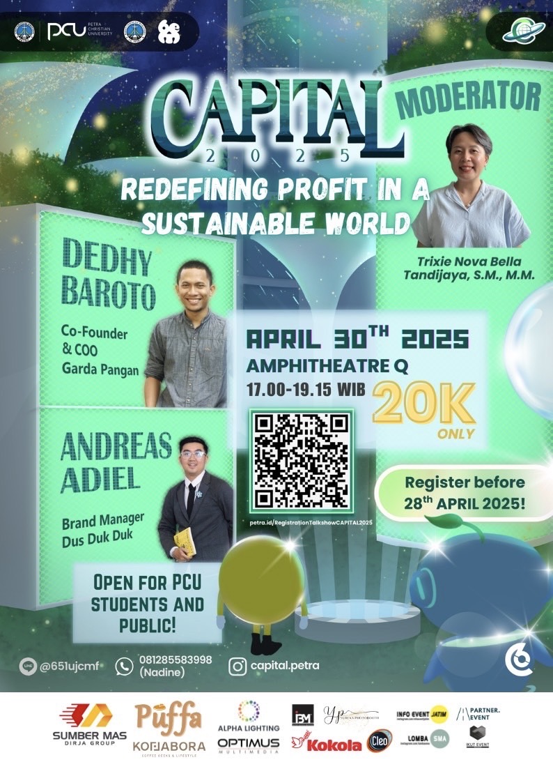 Seminar tentang bisnis akan diselenggarakan oleh Badan Ekseklutif Mahasiswa UK Petra pada 30 April 2025 jam 17.00 - 19.15 WIB bertempat di Amphitheatre Q. Dengan mendatangkan beberapa narasumber, antara lain: Dedhy Baroto, Andreas Adiel serta moderator Trixie Nova Bella Tandijaya.