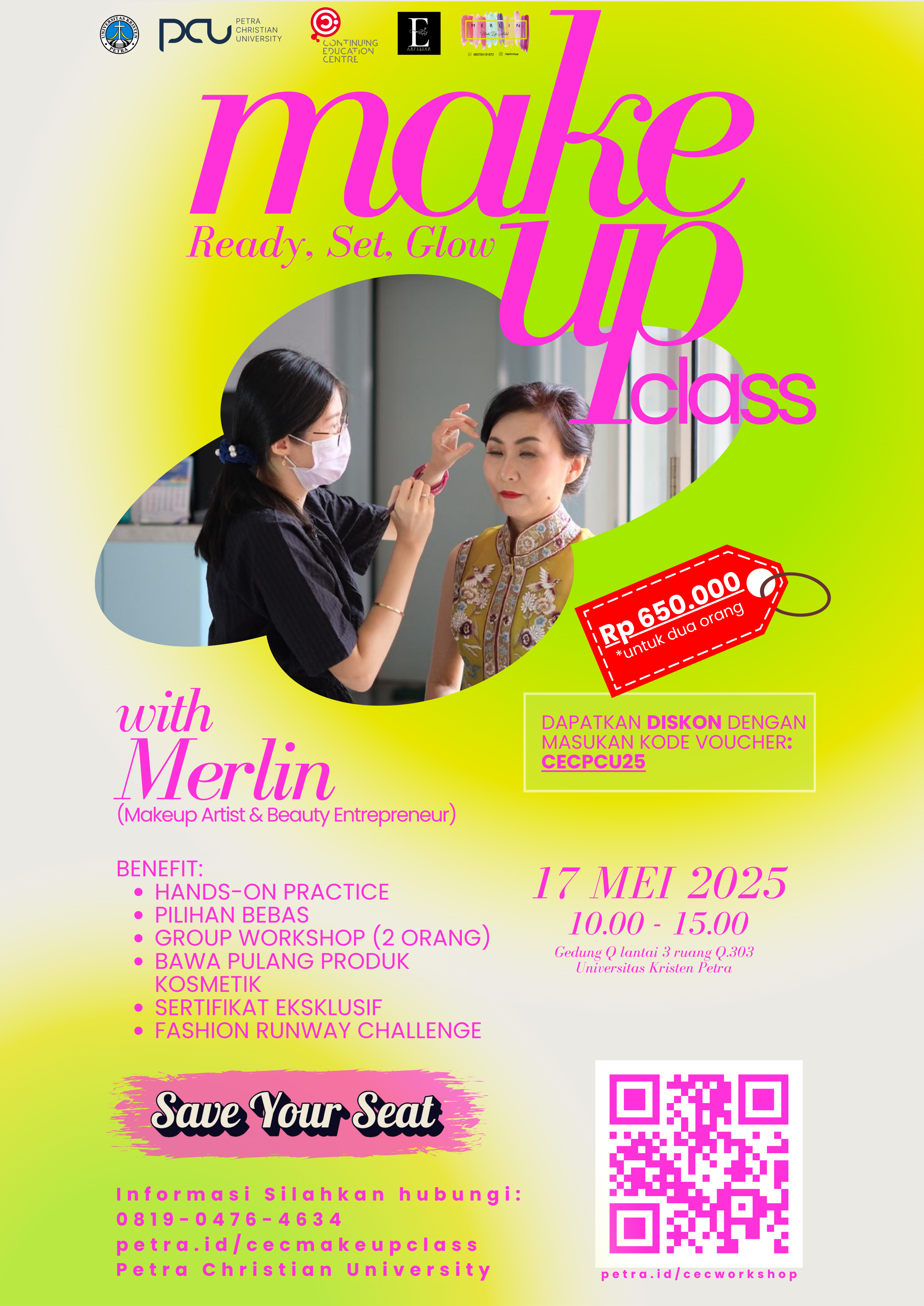 ✨ Ready to SLAY the Night, Gorgeous? ✨Let the spotlight be yours di GLAM EVENING MAKEUP CLASS bareng @merlinmua , Professional Makeup Artist kece! 💄🌟🎨 Belajar langsung step-by-step makeup glamour dari sore sampai malam—dari complexion flawless sampai mata cetar membahana!🔥 WHY YOU NEED TO BE THERE:💋 Hands-On Practice – Langsung praktik! Gampang banget buat pemula, seru buat yang mau leveling up!👯 Duo Deal: 599K for 2! – Daftar bareng bestie sebelum 26 April & dapet harga spesial!🙌 Self or Partner Makeup? – Kamu pilih! Mau tampil kece sendiri atau belajar jadi MUA.🎁 Free Makeup Products & Tools – Bisa dibawa pulang!📜 Eksklusif Sertifikat – Bukti kamu pernah join kelas glam ini!👠 Mini Runway Challenge – Tunjukin hasil makeup kamu dan menangkan hadiah spesial!📅 SAVE THE DATE:🗓️ 17 Mei 2025 | ⏰ 10.00 – 15.00 WIB📍 Universitas Kristen Petra, Gedung Q🎟️ Daftar sekarang di: petra.id/cecworkshop🔍 Info lengkap: petra.id/cecmakeupclass🚨 Limited seats only! Jangan sampai kehabisan tempat yaa!Dan hey… event ini bukan cuma buat ladies loh! Cowok-cowok yang passionate di dunia makeup, you’re more than welcome!💫 LET’S GLOW UP TOGETHER!Tampil stunning, lebih percaya diri, dan siap jadi versi paling glam dari dirimu! 💖✨