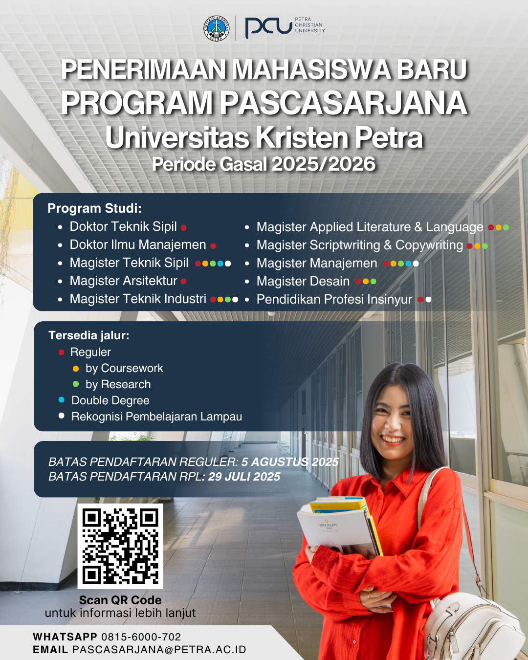 Universitas Kristen Petra Surabaya, membuka pendaftaran mahasiswa baru bagi program pasca sarjana. Pendaftaran dibuka hingga tanggal 05 Agustus 2025