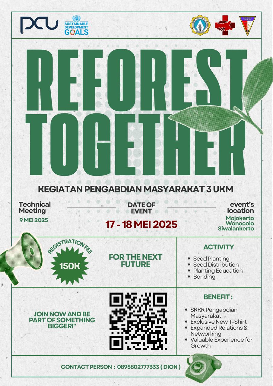 Unit Ketahanan Kampus Universitas Kristen Petra Surabaya melalui 3 UKM yang diasuhnya mengadakan kegiatan penanaman pohon. Kegiatan ini dilakukan di 3 tempat yang berbeda, Mojokerto, Wonocolo, Siwalankerto pada tanggal 17-18 Mei 2025, dengan cara penanaman dan pemberian bibit (saat Car Free Day juga) pada warga sekitar, targetnya adalah 1000 bibit.