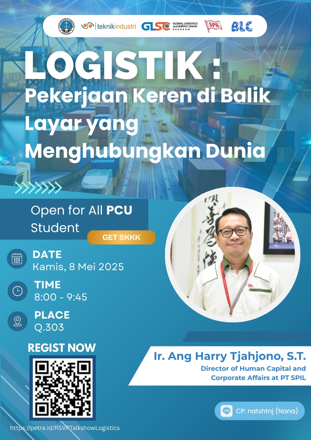 Program Studi Teknik Industri Universitas Kristen Petra Surabaya Pada Kamis, 08 Mei 2025 jam 08.00-09.45 WIB mengadakan talkshow tentang bisnis Logistik. Dengan narasumber Ir. Ang Harry Tjahjono, ST. Dalam talkshow ini, peserta diajak memahami bahwa di balik setiap pengiriman barang atau e-commerce ada peran besar industri logistik. Peserta dapat mengeksplorasi proses pengiriman barang yang menarik dan mendalami peluang karir menjanjikan di bidang logistik.