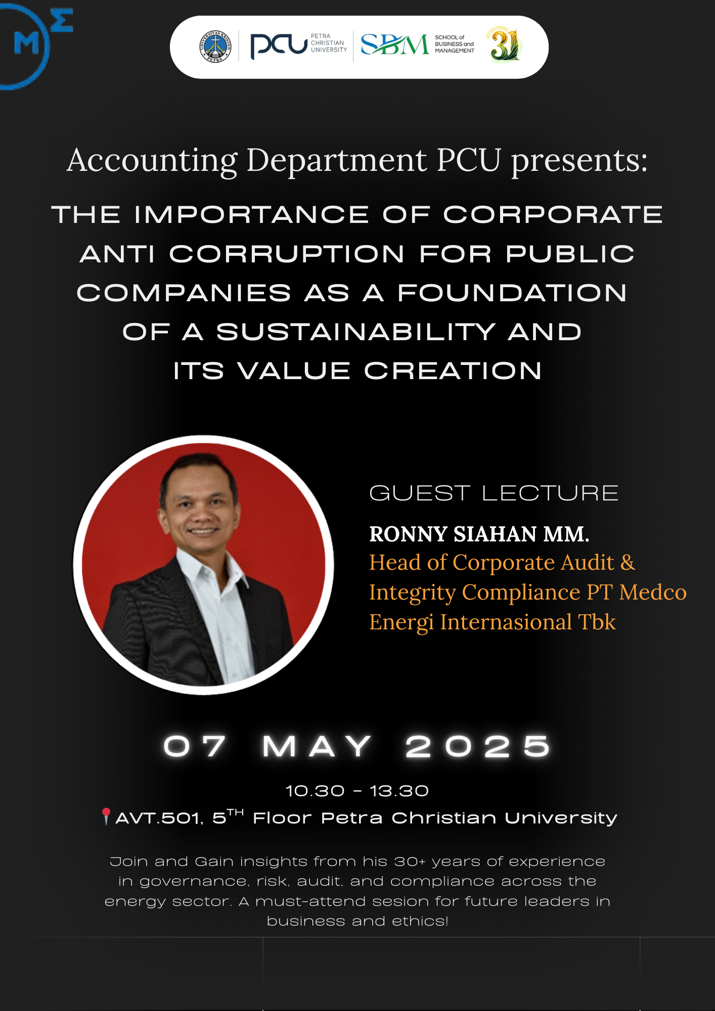 Program Studi Akuntansi UK Petra Surabaya pada tanggal 07 Mei 2025 jam 10.30 - 13.30 WIB mengadakan avcara seminar dengan topik "The importance of corporate anti corruption for public companies as a foundation of a sustainability and its value creation". Dengan narasumber Ronny Siahaan, MM.