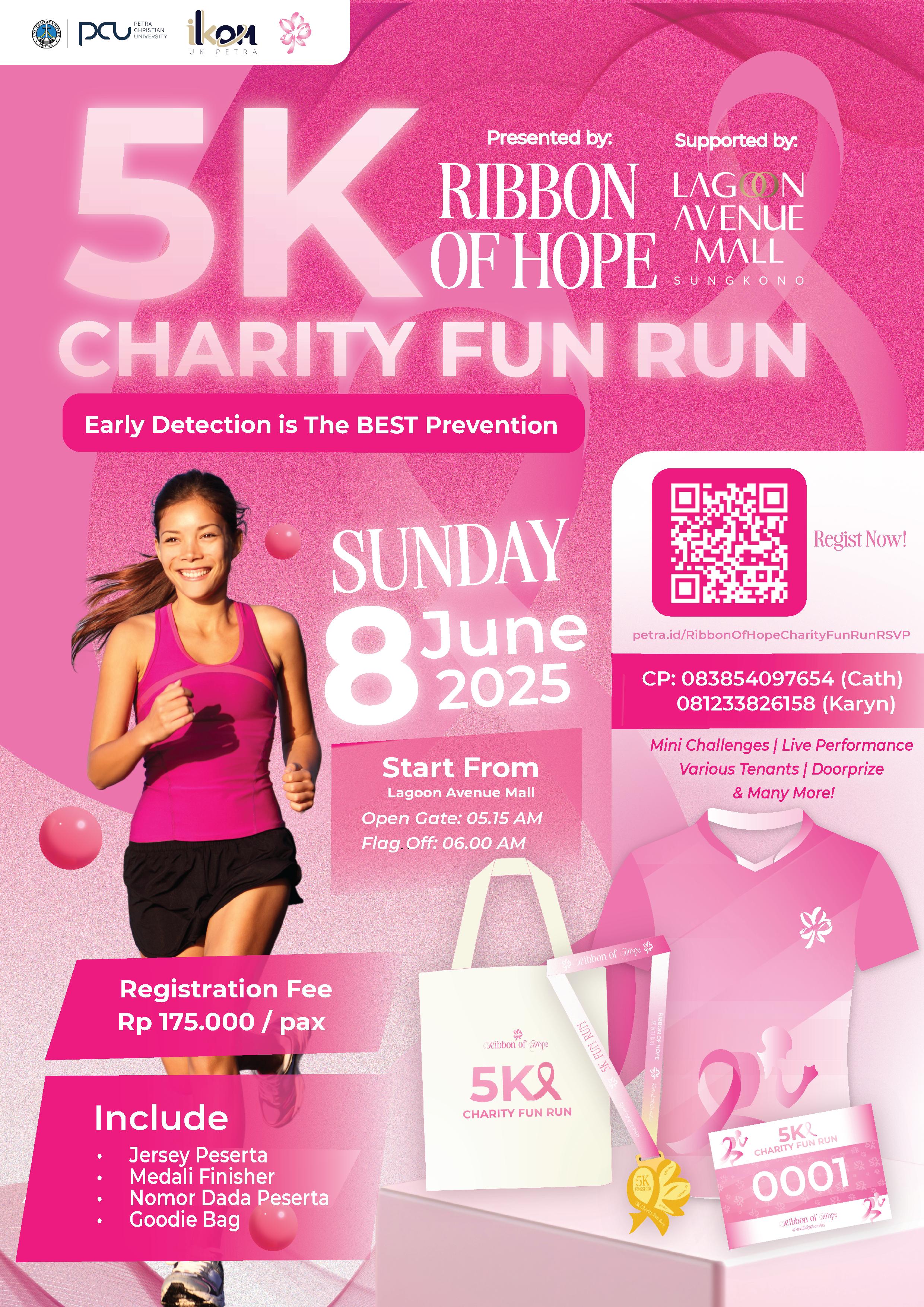 dalam memeriahkan acara deteksi dini kanker payudara, diadakan pula lomba lari 5K fun run. Lomba lari ini diselenggarakan 08 Juni 2025 jam 06.00 pagi dan bertempat di Lagoon Evenue Mall.