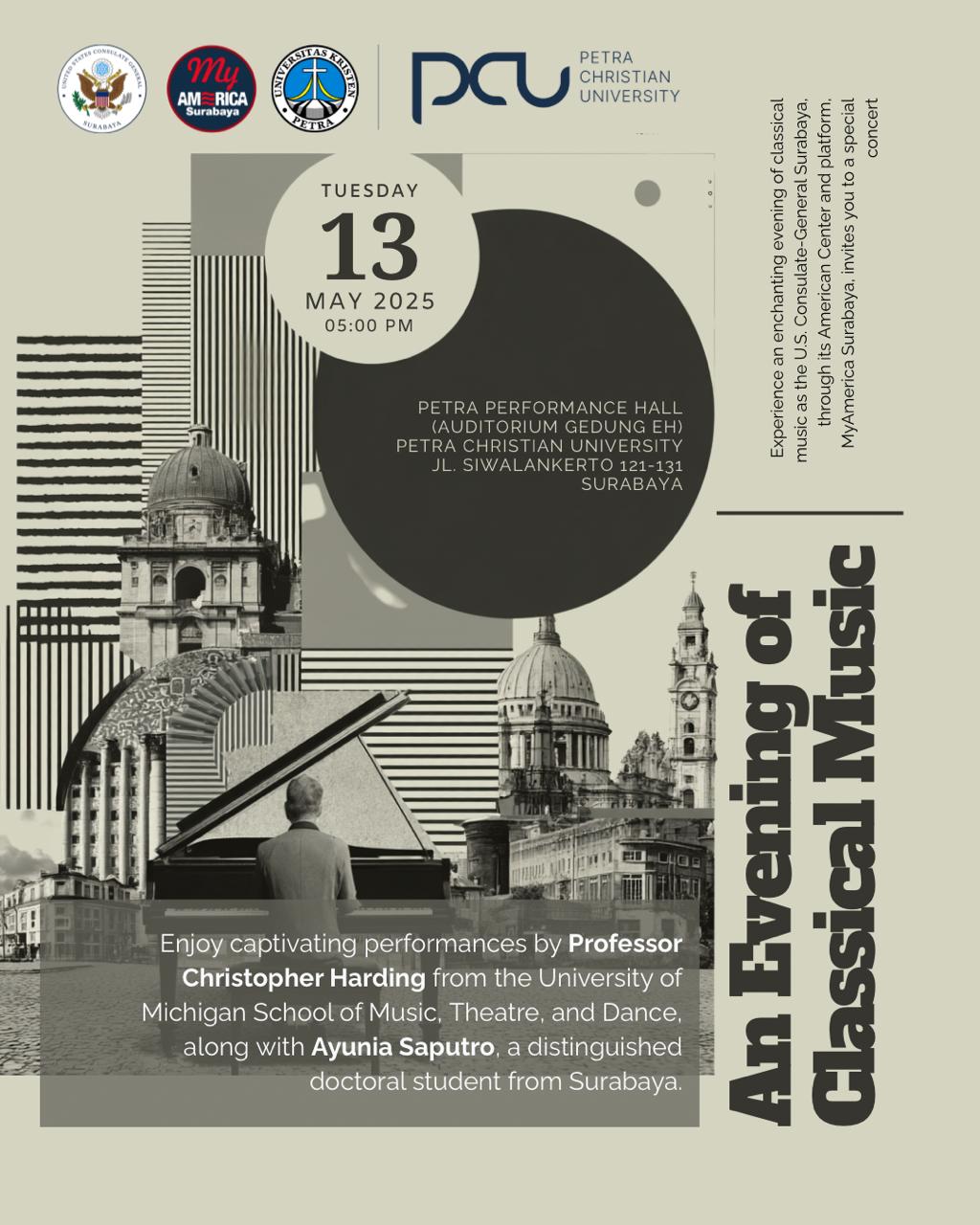 Nikmati malam musik klasik yang memukau saat Bagian Hubungan Masyarakat, Konsulat Jenderal AS di Surabaya, melalui American Center dan platformnya, MyAmerica Surabaya, mengundang Anda ke konser istimewa. Nikmati penampilan memukau dari Profesor Christopher Harding dari Fakultas Musik, Teater, dan Tari Universitas Michigan, bersama Ayunia Saputro, mahasiswa doktoral terkemuka dari Surabaya. Acara ini juga akan menampilkan tujuh seniman muda yang mewakili tujuh sekolah musik di Surabaya. Acara ini merupakan kesempatan unik untuk menyaksikan kekuatan diplomasi budaya dan keindahan kolaborasi internasional melalui musik.