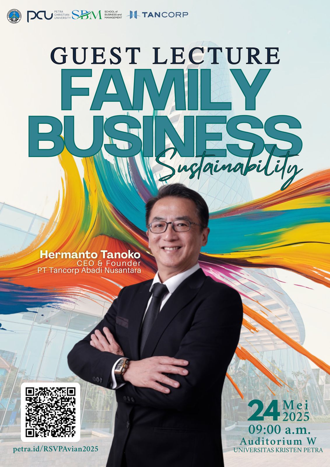 Program Manajemen Bisnis Universitas Kristen Petra Surabaya pada Sabtu, 24 Mei 2025 jam 09.00 WIB mengadakan acara Guest lecture: family business sustainability. Bersama Bapak 𝐇𝐞𝐫𝐦𝐚𝐧𝐭𝐨 𝐓𝐚𝐧𝐨𝐤𝐨, CEO & Founder 𝐏𝐓 𝐓𝐚𝐧𝐜𝐨𝐫𝐩 𝐀𝐛𝐚𝐝𝐢 𝐍𝐮𝐬𝐚𝐧𝐭𝐚𝐫𝐚, akan mengupas tuntas mengenai “𝐅𝐚𝐦𝐢𝐥𝐲 𝐁𝐮𝐬𝐢𝐧𝐞𝐬𝐬 𝐒𝐮𝐬𝐭𝐚𝐢𝐧𝐚𝐛𝐢𝐥𝐢𝐭𝐲” yang bukan cuma teori, tapi pengalaman nyata dari pelaku langsung!