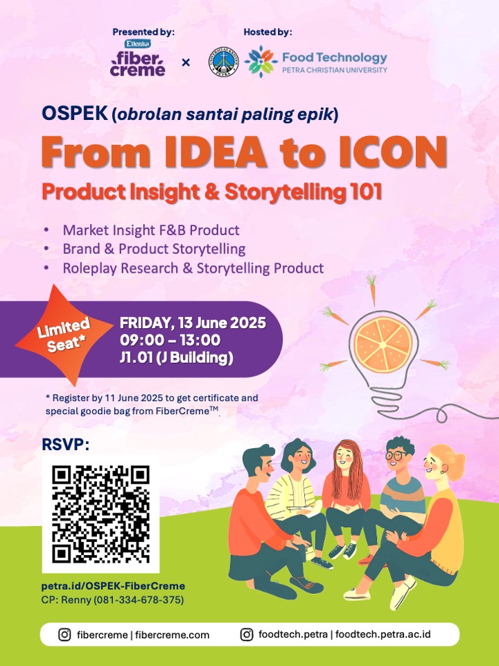 13 Juni 2025 jam 09.00 - 13.00 WIB tempat J.1.01 akan diselenggarakan acara OSPEK (Obrolan Santai Paling Epik) dengan topik "From Idea to Icon". Kegiatan ini merupakan kolaborasi Prodi Teknologi Pangan UK Petra bersama industri FiberCremeâ„¢, yang bertujuan untuk memperkenalkan dunia inovasi produk pangan, pasar produk, serta branding produk dalam bentuk talkshow interaktif dan simulasi kreatif.